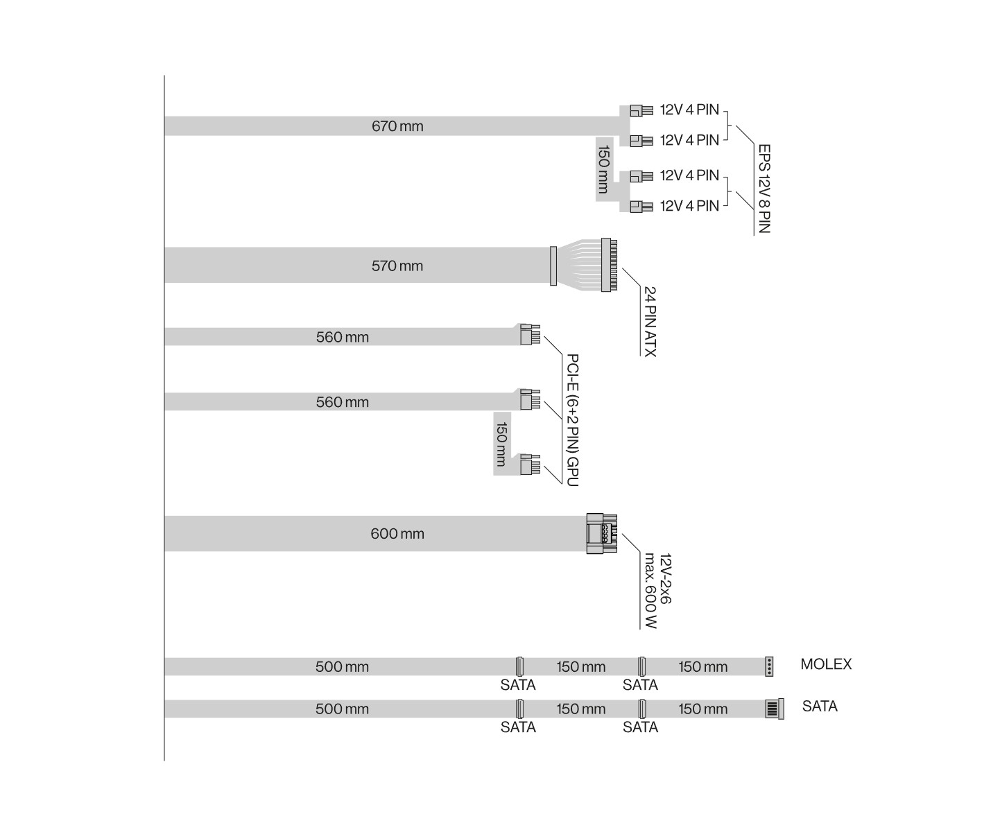 Zasilacz nie ma modularnego okablowania – wszystko jest na stałe przymocowane do konstrukcji. Dostępne wiązki oraz długości najlepiej przedstawia poniższy screen.