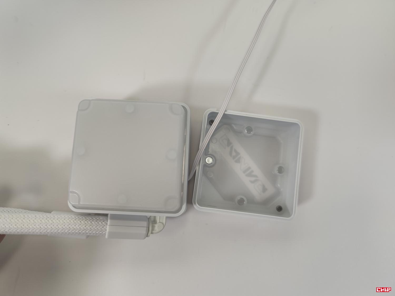 Blok ma wymiary 66 x 66 x 63 mm. Ma on podświetlenie i wychodzi z niego kabel ARGB z końcówką męską i żeńską. Górną część można zdjąć i obrócić – tym samym dopasować do orientacji po montażu. Podstawka jest miedziana, a elementy montażowe wsuwamy od boku bloku.