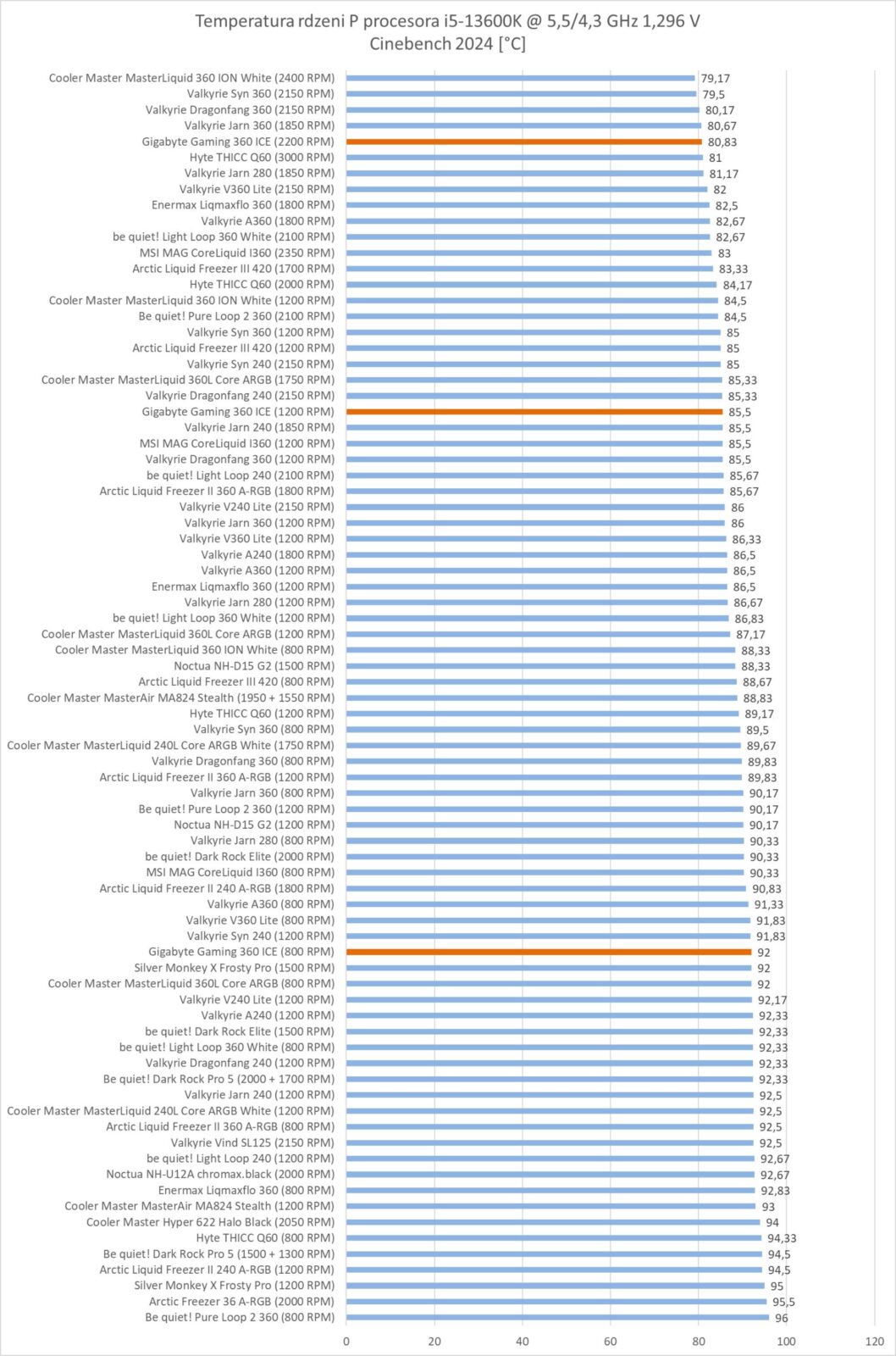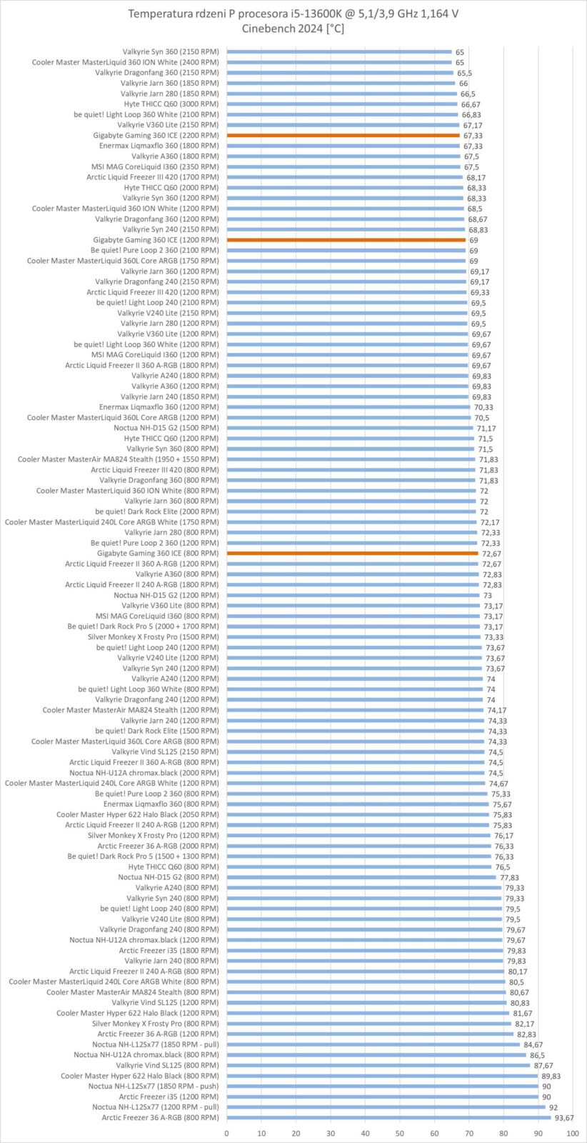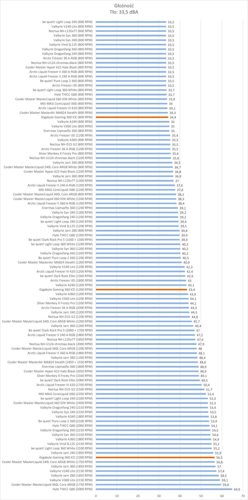 Po OC procesora chłodzenie radzi sobie lepiej i Gigabyte Gaming 360 ICE wskoczył na 5 miejsce, co jest naprawdę dobrym rezultatem. Na 1200 RPM jest ponownie znakomicie, przy 800 RPM też notuje dobry wynik.