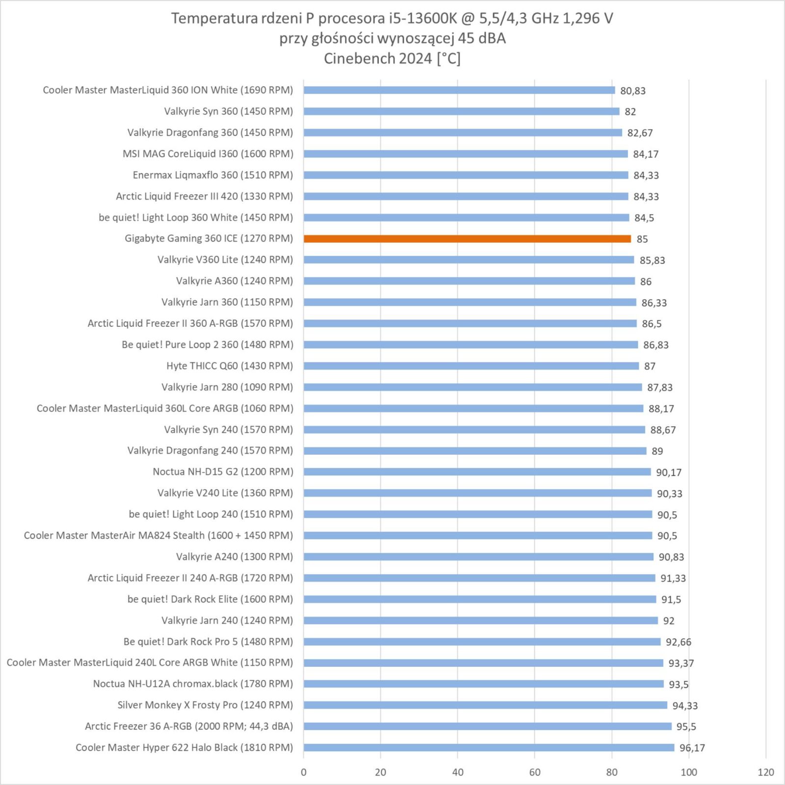 Przy 45 dBA jest już trochę słabiej i chłodzenie uplasowało się mniej więcej w połowie wszystkich AiO 360. Nie jest to zły wynik, ale gdyby wentylatory były cichsze to z pewnością AiO znalazłoby się wyżej w tym zestawieniu.