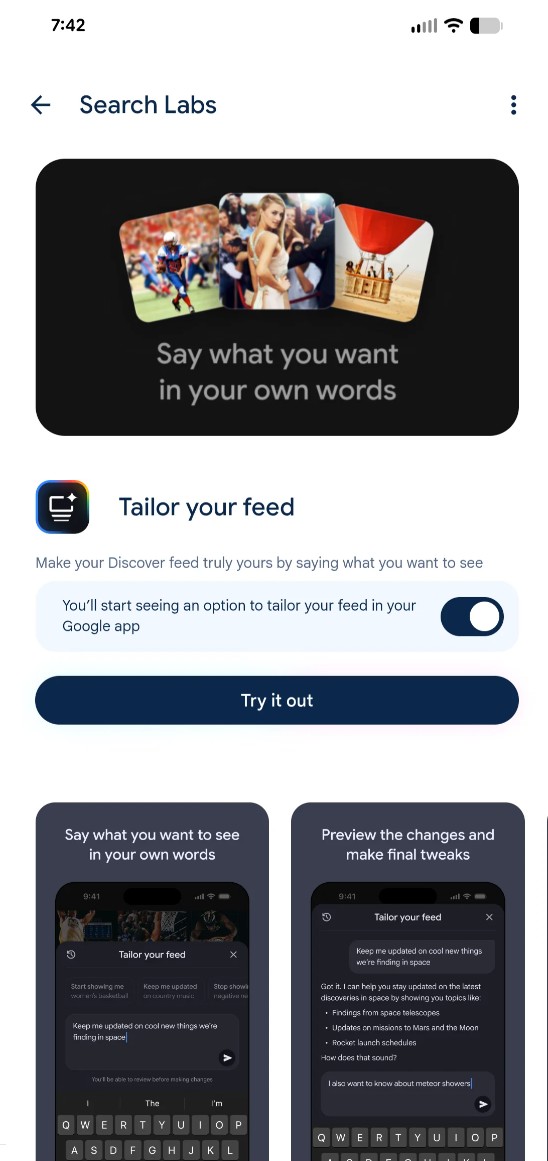 Nowość jest obecnie dostępna wyłącznie w ramach programu Search Labs. Aby ją wypróbować, musisz się zarejestrować w programie. Następnie w aplikacji Google (na telefonie) poszukaj nowej ikony Labs w lewym górnym rogu i w nią kliknij, a potem przewiń do sekcji “Tailor your feed” i wybierz „Włącz”. Jeśli Twój Discover często pokazuje treści, które Cię irytują, i jesteś gotów poświęcić chwilę na dokładniejsze poinformowanie giganta o swoich zainteresowaniach, ta opcja jest stworzona dla Ciebie. Daje to nadzieję na znacznie bardziej relewantne i mniej męczące doświadczenie mobilne.