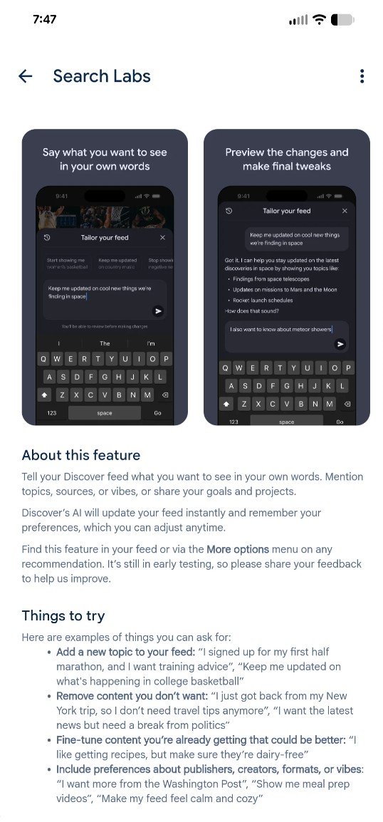 Nowy eksperyment zmienia tę dynamikę, wprowadzając pole tekstowe, które komunikuje się bezpośrednio ze sztuczną inteligencją. Użytkownicy mogą “Poinformować swój kanał Discover, co chcą zobaczyć, własnymi słowami”. Możliwości są naprawdę szerokie: