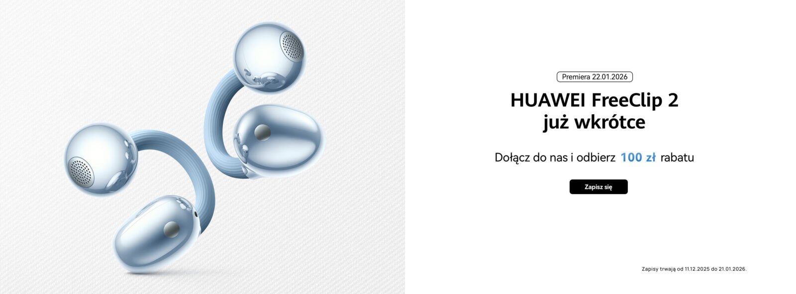 - FreeClip 2 – aby odebrać kupon na słuchawki, trzeba zapisać się na listę mailingową na stronie huawei.pl do 21 stycznia 2026 r.. Kod zostanie przesłany w dniu premiery, 22 stycznia.