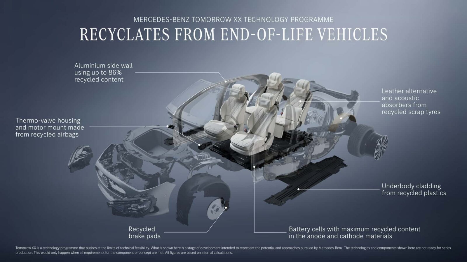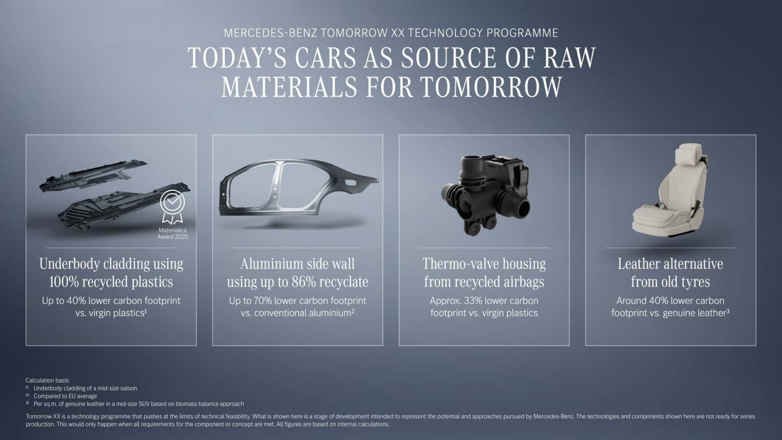 Marka eksperymentuje także z innymi rozwiązaniami, jak wykorzystanie włókien ze zużytych opon w tłumikach drgań czy produkcji kieszeni w drzwiach z recyklingowanego PET, co ma obniżyć ich wagę o 40 procent. Nawet klocki hamulcowe mają w około 40 procentach składać się z odpadów pochodzących ze starych okładzin. Mercedes nie jest oczywiście samotnym producentem na tym ekologicznym polu. W całej Europie trwa aktualnie przemysłowy wyścig o zmniejszenie śladu węglowego i zwiększenie udziału surowców wtórnych. Jaguar Land Rover planuje na przykład usunięcie magnezu z belki poprzecznej deski rozdzielczej, co ma rocznie obniżyć emisję CO₂ o ponad 50 tysięcy ton. BMW chwali się, że w jego nowym elektrycznym iX3 około jednej trzeciej masy stanowią materiały z recyklingu.