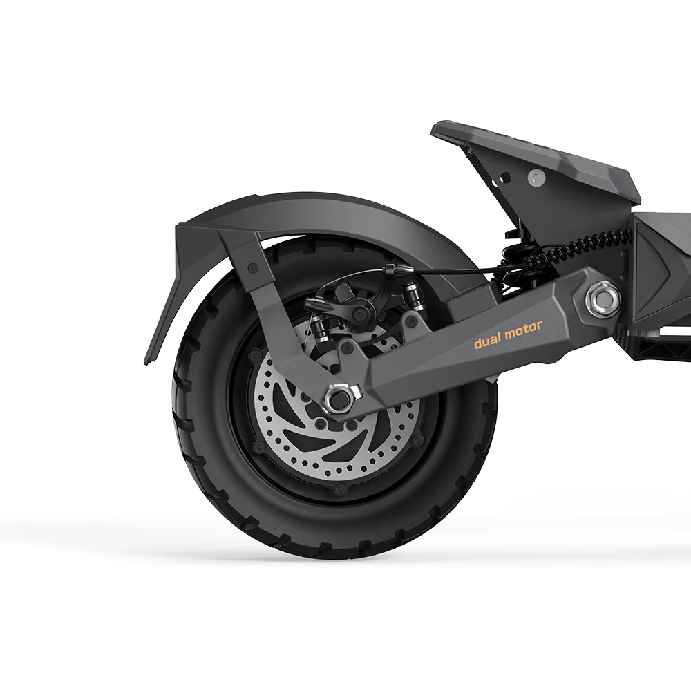 W miastach (i na obrzeżach miast) najczęściej wygrywa nie sama prędkość, tylko komfort oraz stabilność. W tym modelu mocno widać, że priorytetem było „wygładzenie” jazdy: zastosowano podwójne zawieszenie typu swingarm, które ma redukować wibracje i uderzenia od nierówności, krawężników czy łat w asfalcie. To dokładnie ten element, który sprawia, że hulajnoga mniej męczy na dłuższym dystansie i daje większą pewność w prowadzeniu.