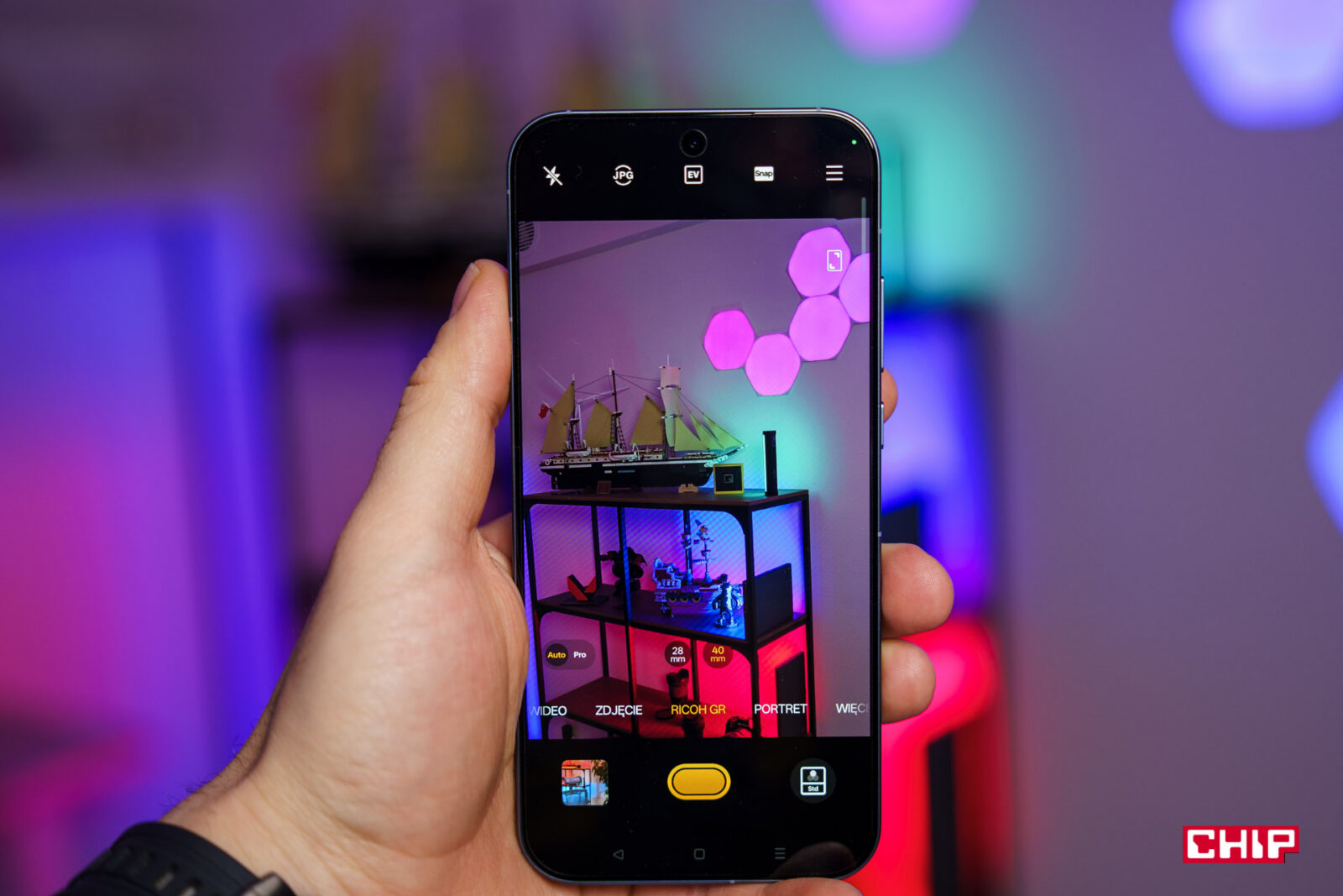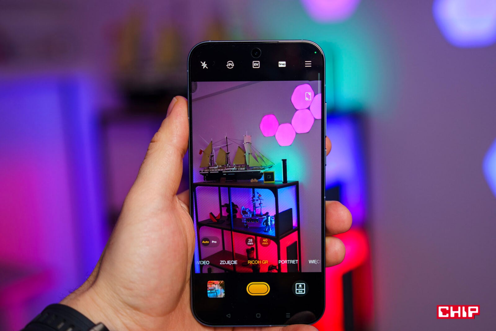 Szkoda tylko, że tryb Ricoh GR działa wyłącznie w aparacie głównym. Do dyspozycji mamy dwie ogniskowe fotografowania – 28 i 40 mm oraz pięć gotowych trybów kolorystycznych do wyboru, a dodatkowo każdy z nich możemy dowolnie, ręcznie modyfikować. Tu daje sporo możliwości kreatywnej zabawy. Mam nadzieję, że to nie będzie jednorazowa współpraca, bo fajnie byłoby zobaczyć działanie trybu Ricoh z aparatem portretowym z teleobiektywem.