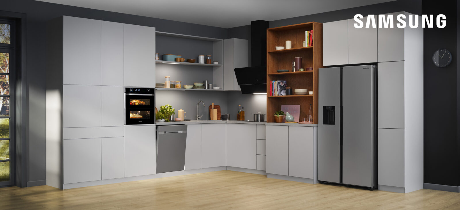 Piekarnik Samsung NV7B7997AAK z kamerą i funkcją Sense Inside pomaga ograniczyć kulinarne wpadki, bo pomaga dobrać program i kontrolować przebieg pieczenia bez ciągłego otwierania drzwi. Płyta NZ64B7799GK z termosondą Assist Cook pilnuje temperatury, żeby wolno gotowane dania czy świąteczne sosy wychodziły tak, jak powinny, bez serii nieudanych prób. Lodówka BRB38G705DWW optymalizuje zużycie energii z AI Energy mode, a zmywarka DW60BB890UAPET pozwala myć skutecznie i — gdy tego chcemy — oszczędniej.