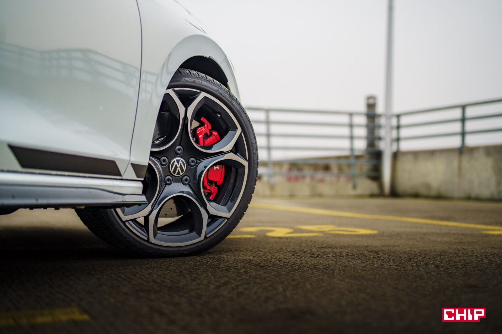 Golf GTI Clubsport to agresywniejszy wygląd przedniego zderzaka, większy tylny spoiler, zmienione progi, dyfuzor pomiędzy sporej wielkości końcówkami wydechów, które w żadnym wypadku nie są atrapą oraz dedykowane, 18 lub 19-calowe (widoczne na zdjęciach), kute felgi. Z zewnątrz widzimy też powiększone tarcze hamulcowe z przodu z efektownymi zaciskami w kolorze czerwonym i napisem GTI. Na boku mamy też niewielką, sportową naklejkę wzdłuż progu.