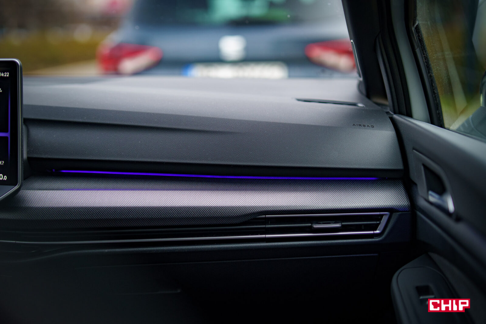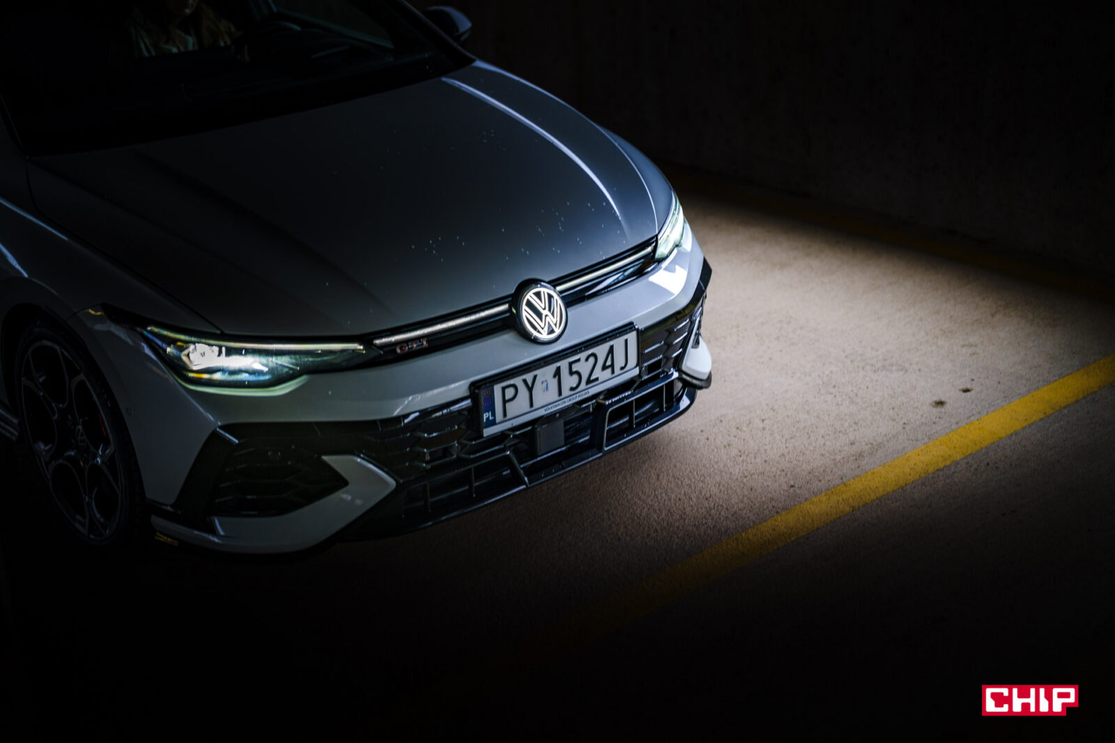 Tym, co bardzo nie podoba mi się nie tylko w Golfie, ale wszystkich współczesnych autach Volkswagena jest podświetlane logo. W GTI Clubsport znajdujące się pośrodku pasa świetlnego. Podświetlane są tylko jego krawędzie. Są to bardzo cienkie linie, które w nocy wyglądają, jak domowa samoróbka LED-ami z AliExress czy innego Temu. Producent mógłby wziąć przykład z Renault, gdzie podświetlane jest całe logo, a nie tylko jego krawędzie i zdecydowanie byłoby to lepsze posunięcie.