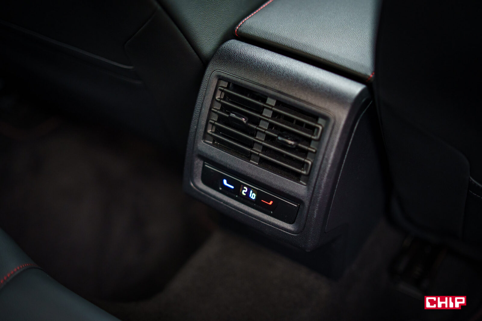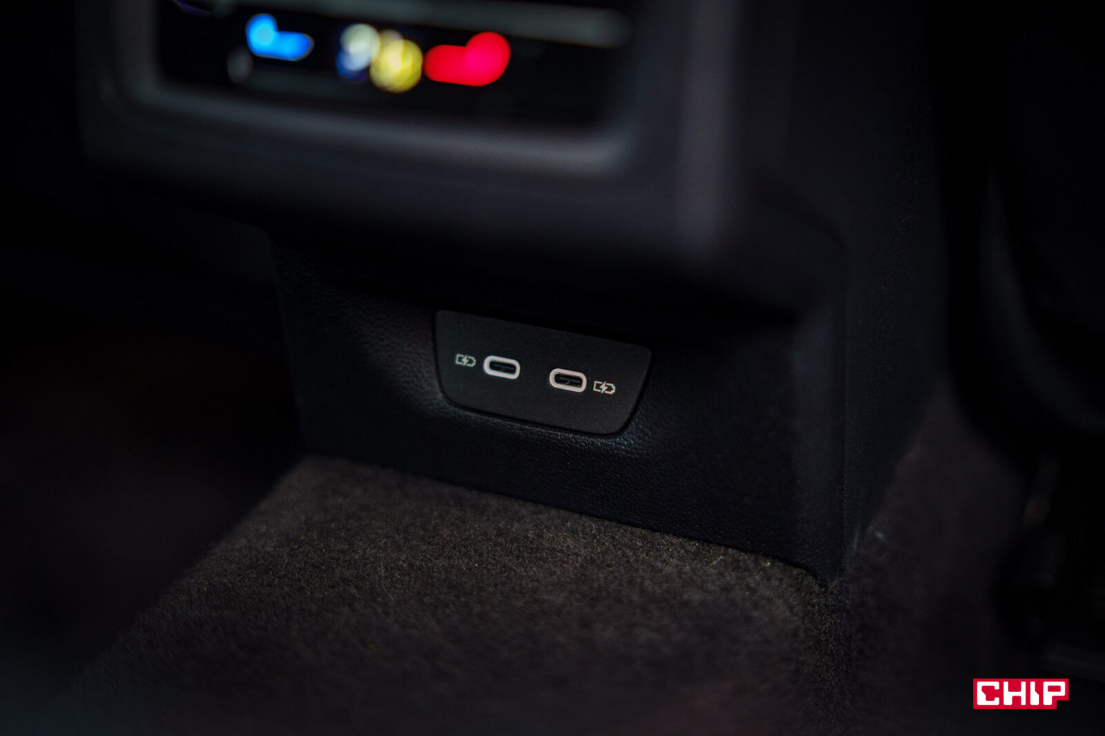 Z miejscem z tyłu jest, jak łatwo jest się domyślić, skromnie, ale bez tragedii. Dwie osoby mogą tu całkiem komfortowo podróżować, a o ile nie są to osoby o wzroście powyżej 190 cm, nie powinny narzekać na brak miejsca nad głową i na nogi. Do dyspozycji jest tu rozkładany podłokietnik, dwa porty USB-C oraz sterowanie klimatyzacją wraz z nawiewami.