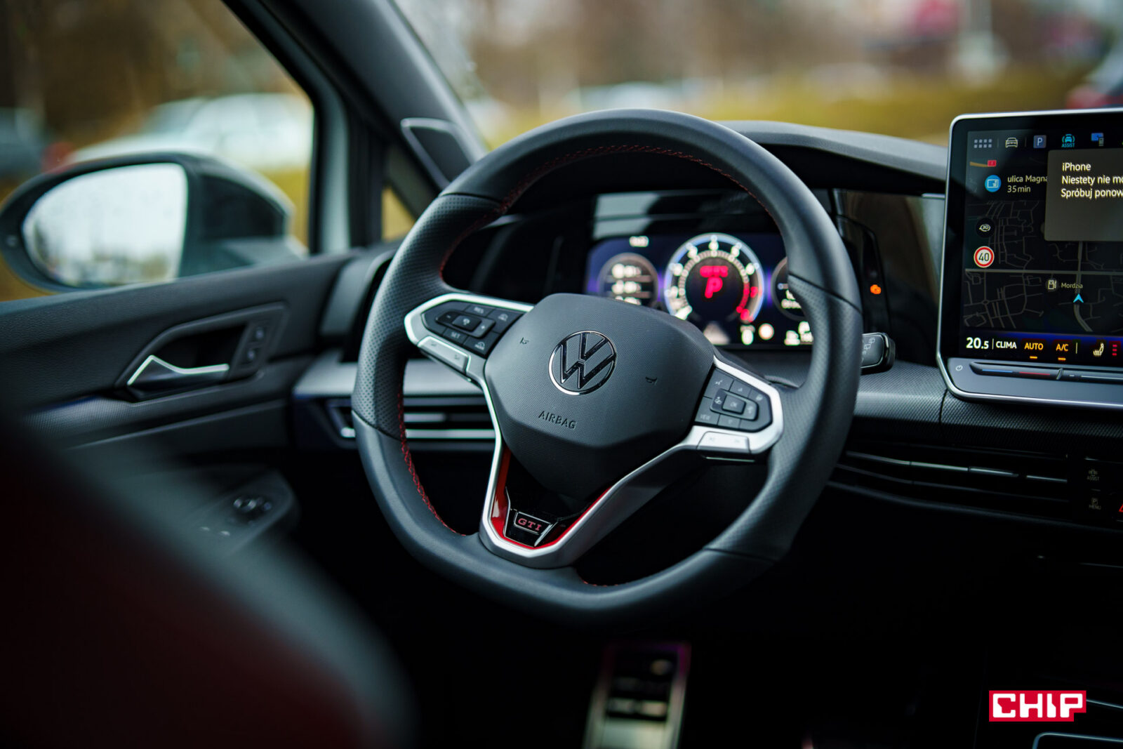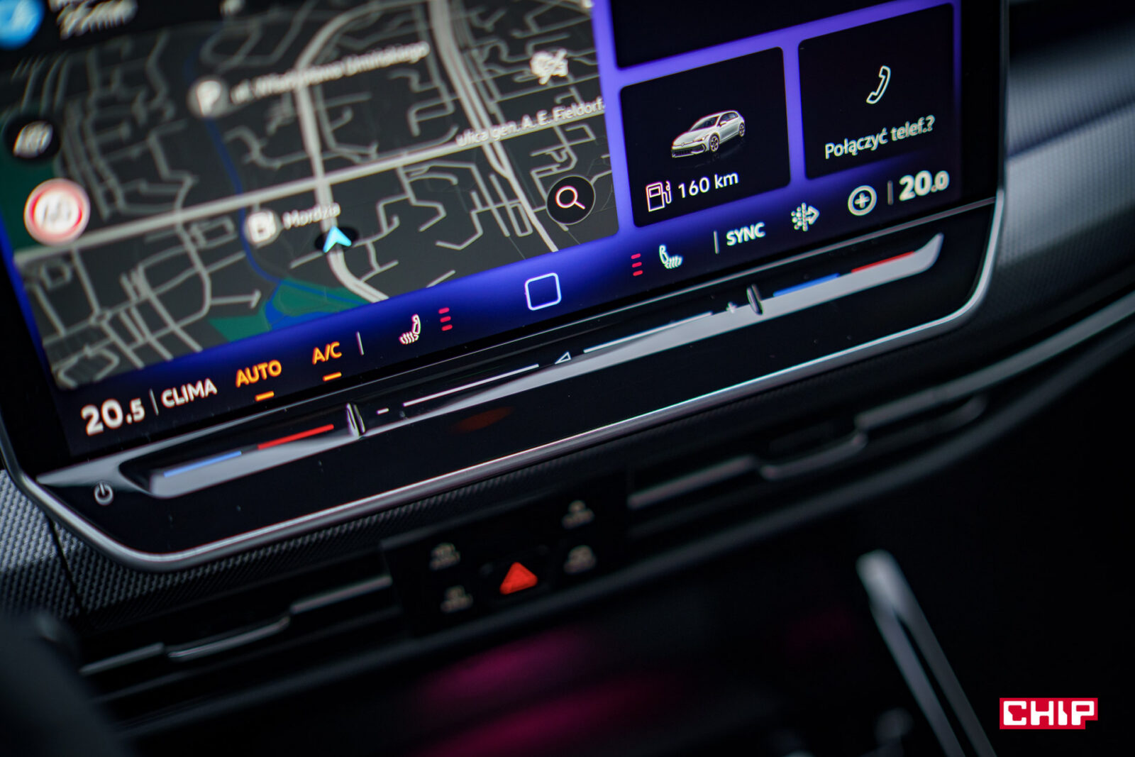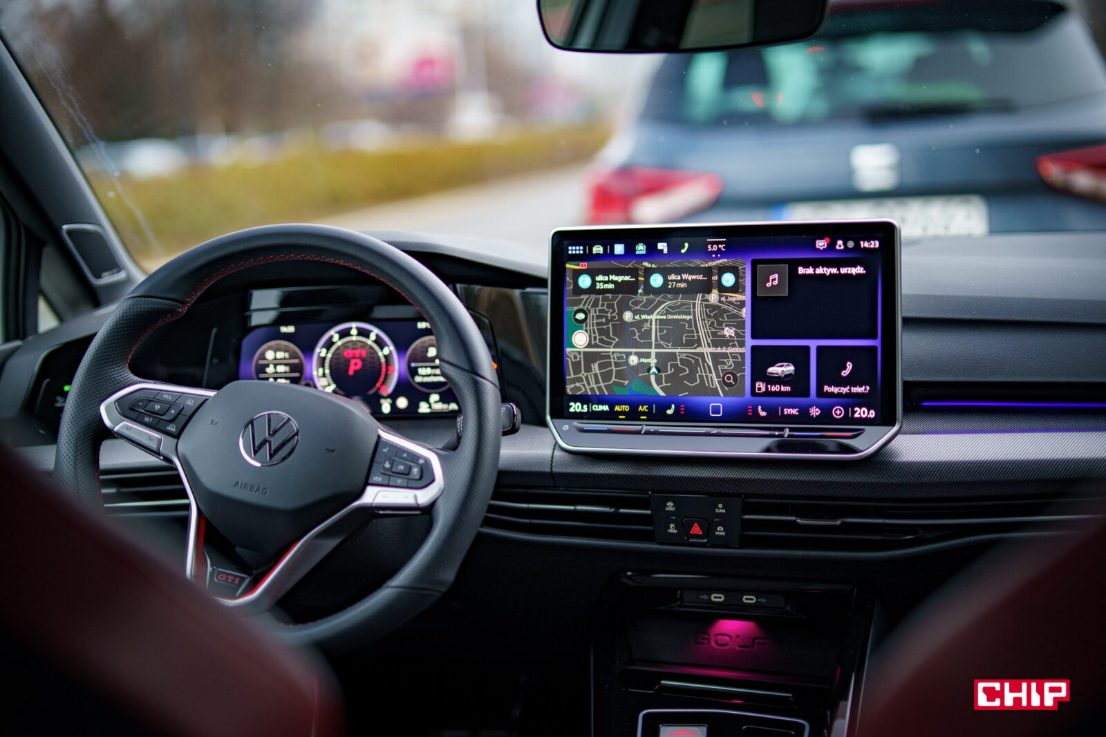 Ekran główny Golfa GTI Clubsport ma przekątną 12,9 cala. Tak jak telewizor nigdy nie jest za duży, tak ekran w samochodzie czasem już tak i przy kompaktowym wnętrzu Golfa wyświetlacz mógłby być nieco mniejszy i niżej osadzony. Nie, żeby jego wymiary w czymś przeszkadzały, ale zdecydowanie góruje nad pozostałymi elementami wyposażenia. Oczywiście łatwo to zrozumieć, Volkswagen stosuje dokładnie te same ekrany we wszystkich aktualnie produkowanych modelach – jest taniej.