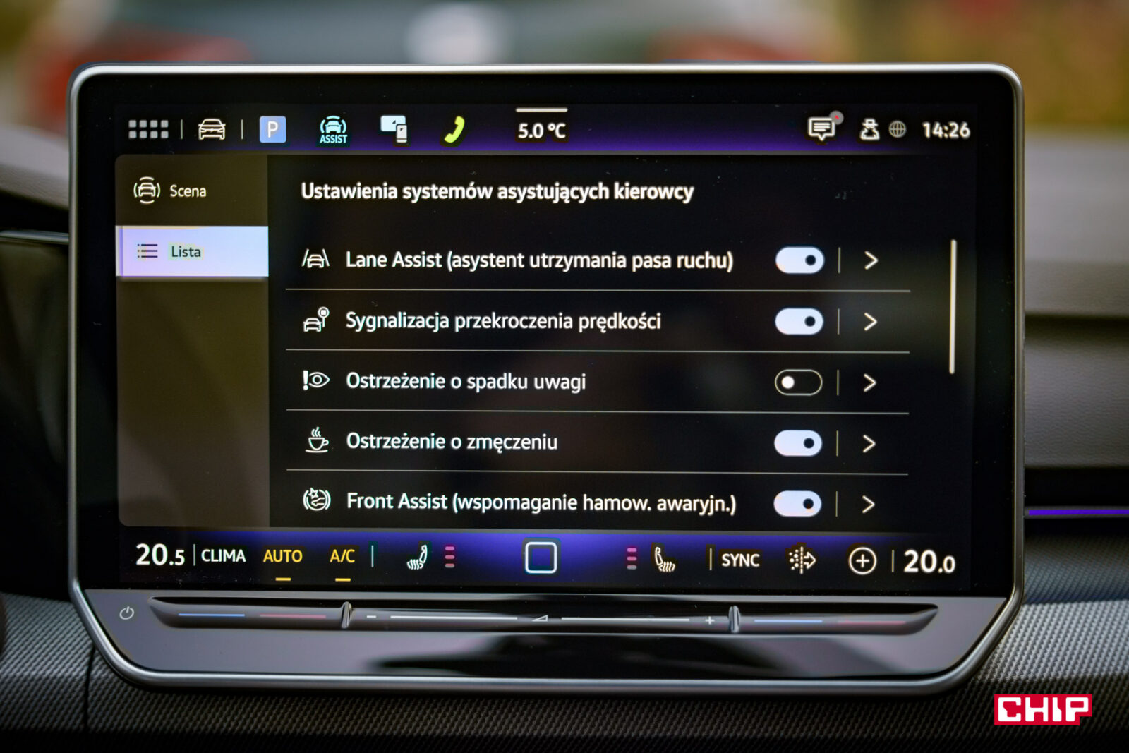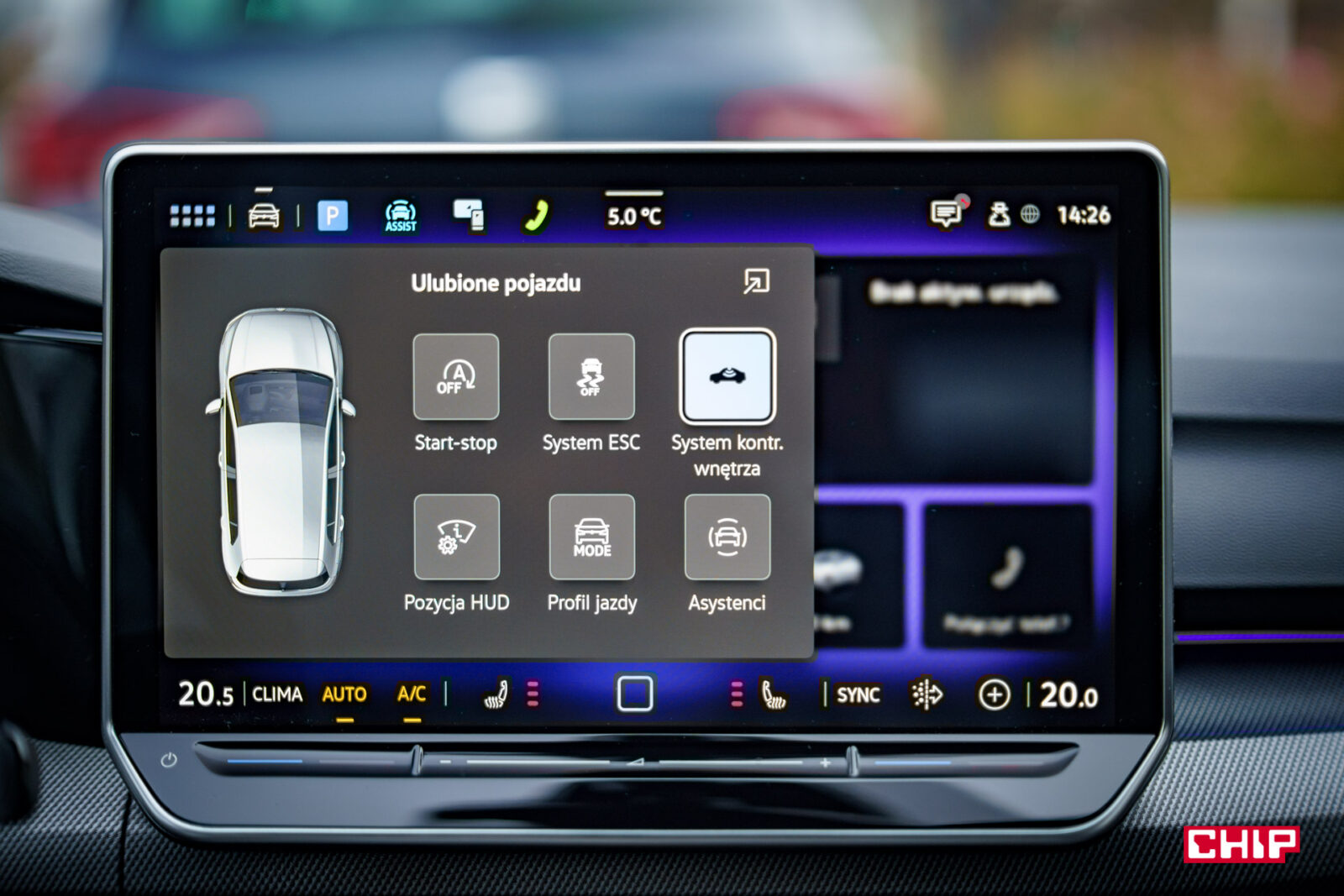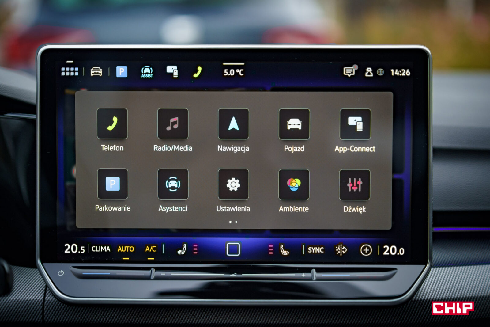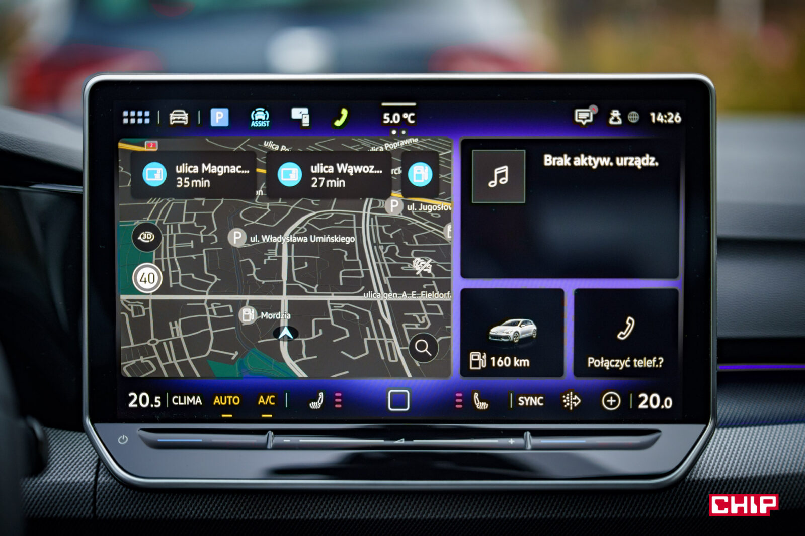 Ekran główny Golfa GTI Clubsport ma przekątną 12,9 cala. Tak jak telewizor nigdy nie jest za duży, tak ekran w samochodzie czasem już tak i przy kompaktowym wnętrzu Golfa wyświetlacz mógłby być nieco mniejszy i niżej osadzony. Nie, żeby jego wymiary w czymś przeszkadzały, ale zdecydowanie góruje nad pozostałymi elementami wyposażenia. Oczywiście łatwo to zrozumieć, Volkswagen stosuje dokładnie te same ekrany we wszystkich aktualnie produkowanych modelach – jest taniej.