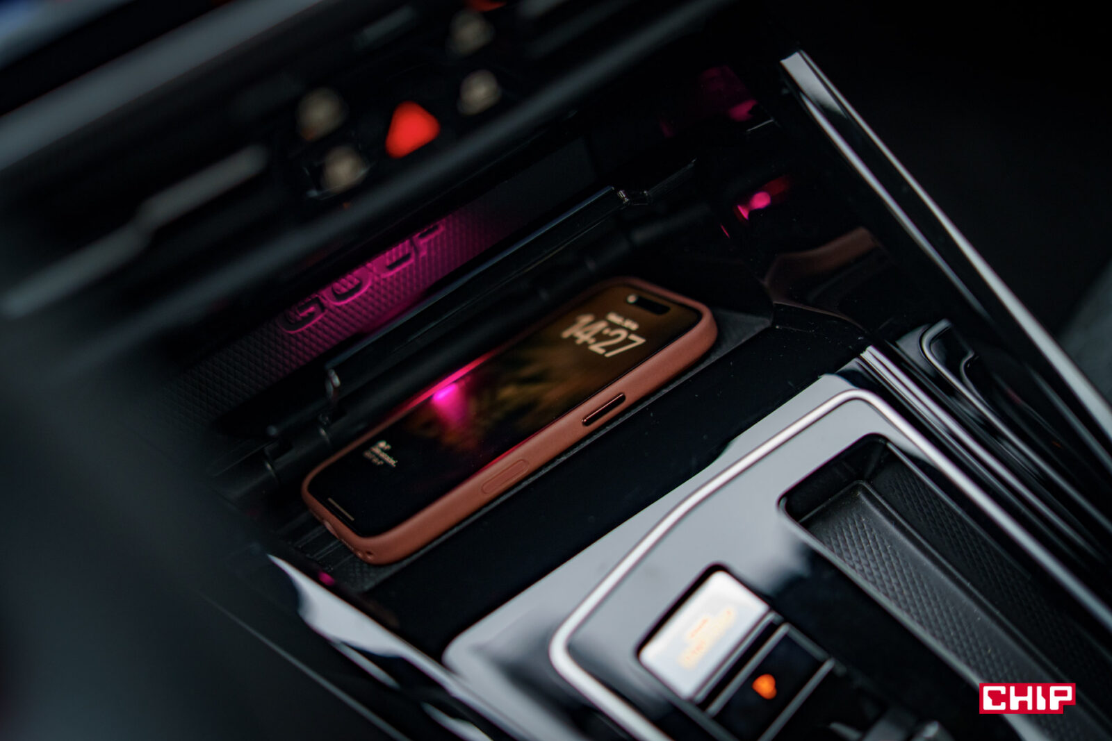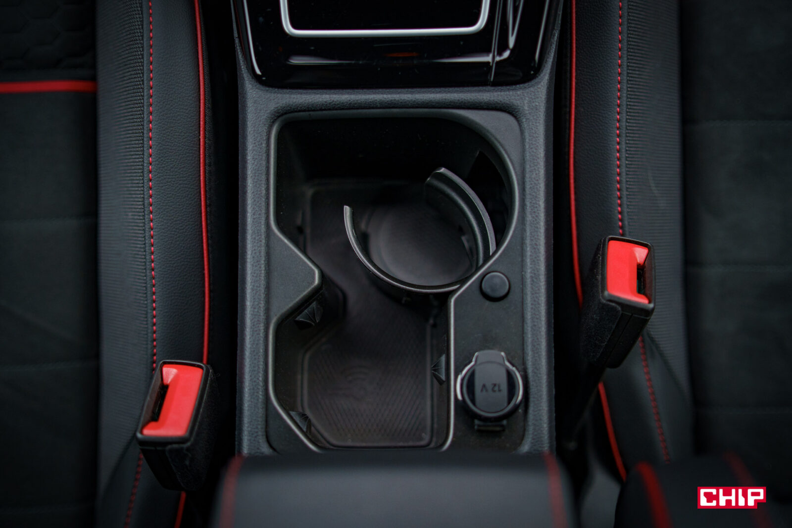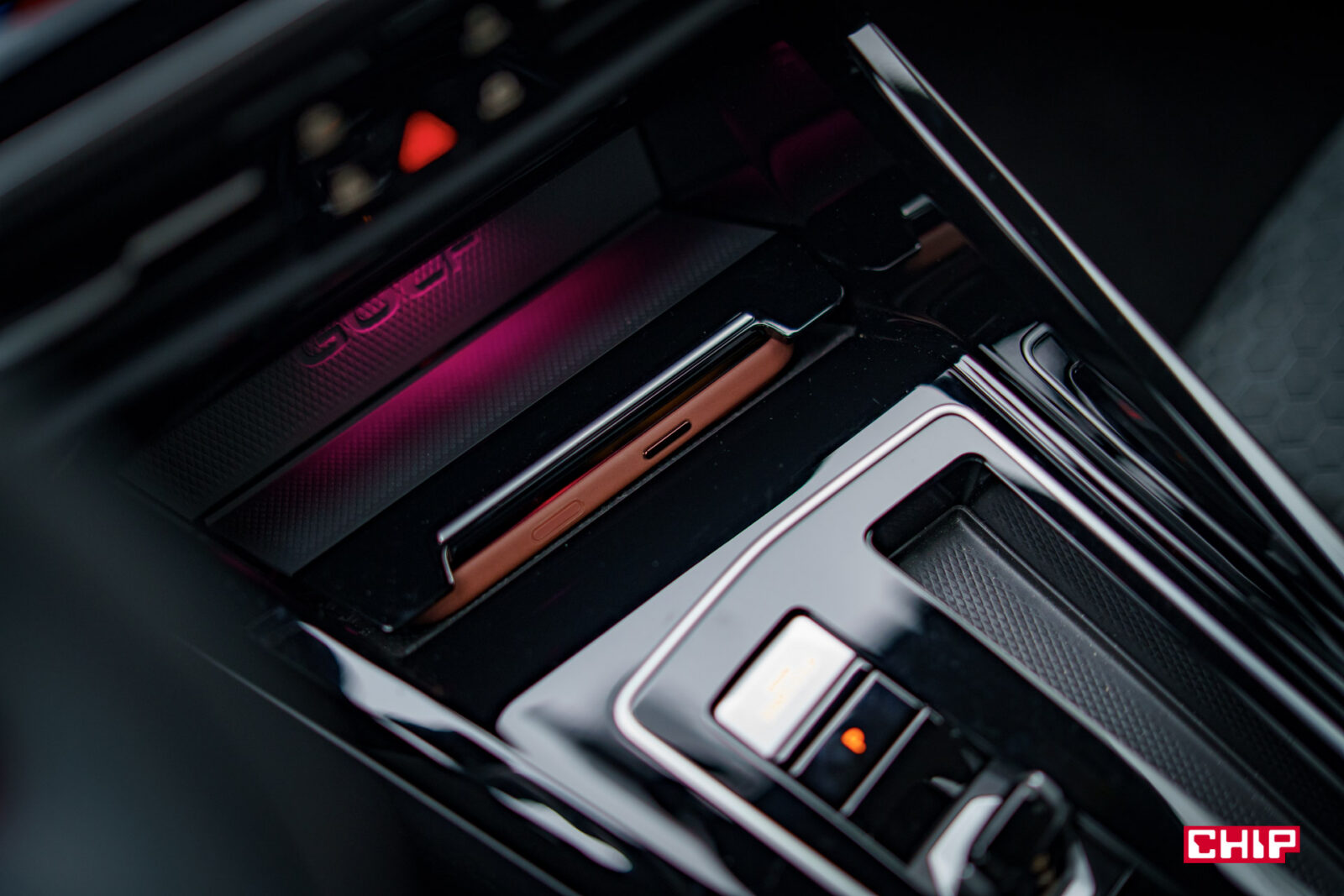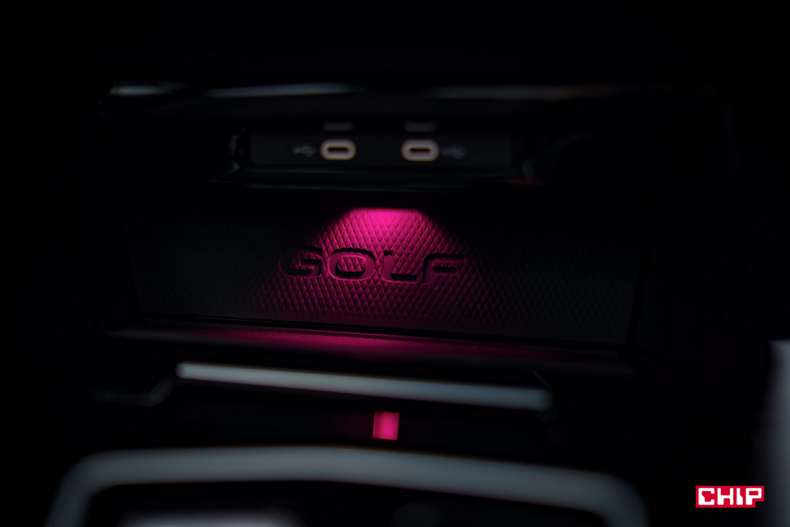 Ciekawym rozwiązaniem jest ładowarka indukcyjna, która znajduje się pod niewielką klapką. Z jednej strony rozwiązanie praktyczne, bo smartfon nie będzie się przesuwać w trakcie jazdy, ale z drugiej półka jest dosyć mocno nachylona, więc nie powinno być z tym problemów. A przez to przy największych modelach będzie brzydko niedomknięta. Nad ładowarką znajdziemy efektownie podświetlone napis Golf. Ciekawy dodatek.