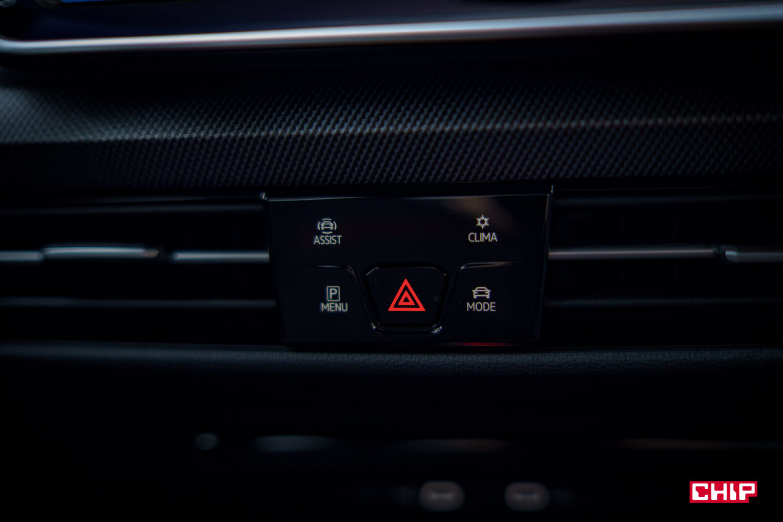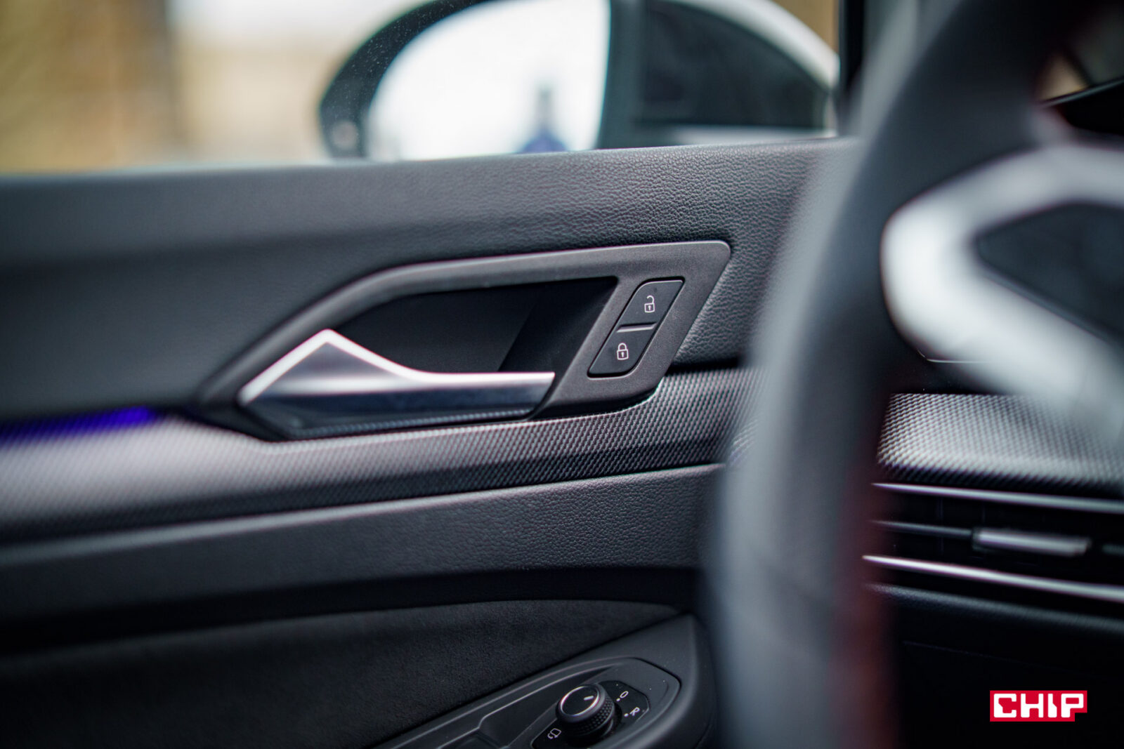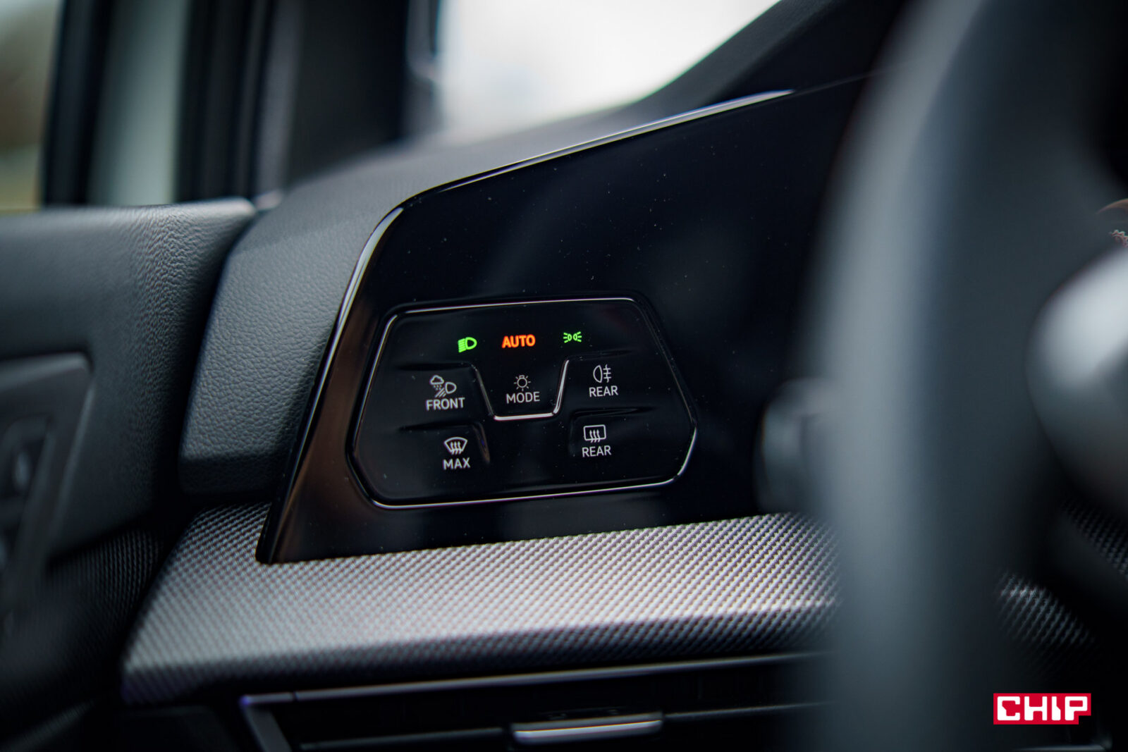 Patrząc na wnętrze Volkswagena Golfa GTI Clubsport aż chce się powiedzieć – jeszcze walczy. Z jednej strony bardzo duży ekran z dotykowymi polami pod nim, z drugiej fizyczne przyciski na kierownicy i drzwiach kierowcy.