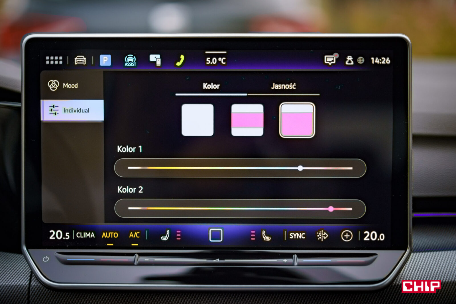 Sterowanie klimatyzacją odbywa się na ekranie lub za pomocą dotykowych pól pod nim. W końcu są one podświetlane, więc jest to jakiś mały plus. Informacje o klimatyzacji są zawsze na dole ekranu, bez względu na to, co aktualnie mamy włączone.