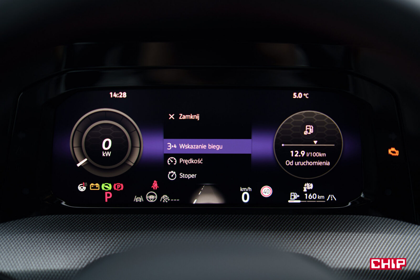 Ekran kierowcy na papierze jest spory, bo ma 10,25 cala, ale mocno ginie w otaczających, wręcz otulających go wielkich ramach z błyszczącego plastiku. Do wyboru mamy trzy widoki – sportowy, klasyczno-okrągły oraz nowoczesno-cyfrowy. Możemy je uzupełnić o dodatkowe informacje dotyczące spalania czy wskazówki nawigacji, albo wskaźniki sportowe. Do dyspozycji jest też head-up.