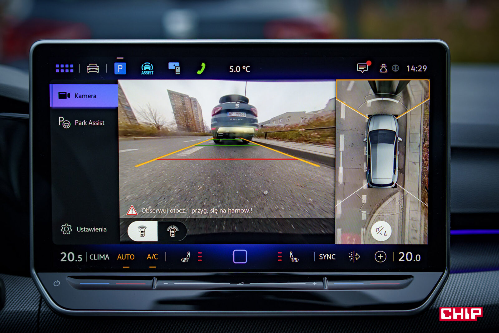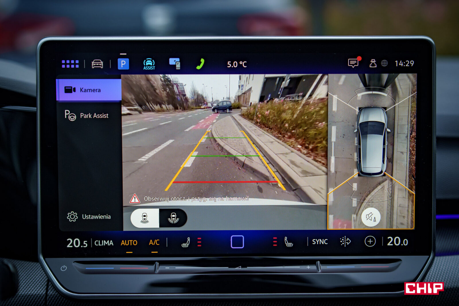 System kamer 360 jest dobrej jakości, choć nie jestem fanem widoku oferowanego przez Volkswagena. Mamy zawsze duży podgląd widoku z kamery z przodu lub z tyłu oraz obok mniejszy widok 360. Nie możemy go w żaden sposób powiększyć. Niemniej widać dużo, w dobrej jakości, nawet w trudnych warunkach oświetleniowych.