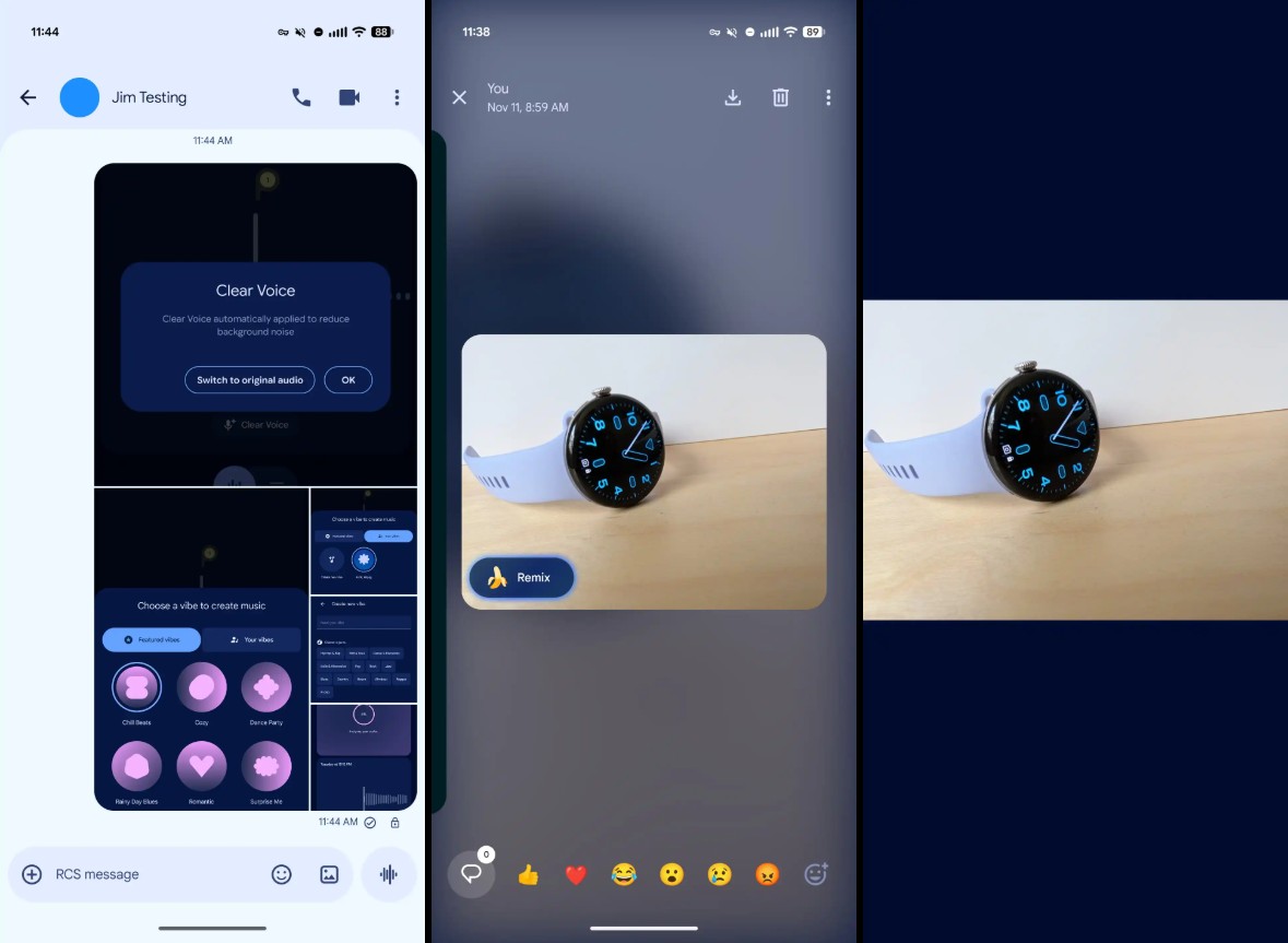- Remiksowanie obrazów z Nano Banana — dostępna po długim naciśnięciu zdjęcia lub wybraniu nowego, funkcja „Remix” pozwala przekształcić obraz za pomocą podpowiedzi tekstowej (promptu), wykorzystując model Nano Banana. Ta funkcja wymaga aktywnego RCS i jest już dostępna w języku angielskim w kilku regionach, w tym w Wielkiej Brytanii, Kanadzie i Stanach Zjednoczonych.