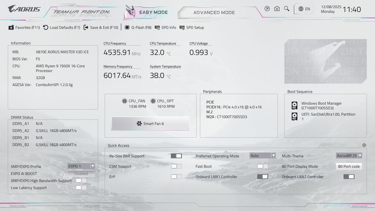 BIOS jest cały biały, czyli zgodny z kolorystyką płyty. W trybie Easy jak zawsze łatwo włączycie EXPO, Resizable BAR czy przejdziecie do sterowania wentylatorami. W zaawansowanym możecie podkręcić procesor, pamięci i wyciągnąć ze sprzętu 100% możliwości. Opcje są poukładane charakterystycznie dla Aorusa i tutaj nie ma zaskoczenia. Trzeba jednak wspomnieć o jednej rzeczy. Jeśli macie procesor z cache 3D to będziecie mogli włączyć funkcję X3D Turbo Mode 2.0. Płyta automatycznie optymalizuje parametry procesora X3D co ma zwiększać jego wydajność nawet do 25%. Warto więc sprawdzić, czy w Waszych grach rzeczywiście zobaczycie tak spory przyrost wydajności.