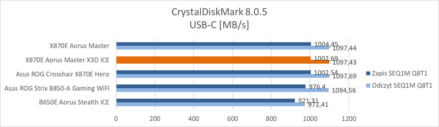 CrystalDiskMark pozwala na ocenienie wydajności dysków podłączonych do różnych złączy. Sprawdziłem tutaj działanie Adata SE800 1 TB na złączach USB oraz Adata SU650 120 GB na SATA. W przypadku M.2 mowa jest o dysku systemowym Crucial T700 1 TB PCIe 5.0 x4. Warto też zwrócić uwagę na samą temperaturę tego dysku ukrytego pod radiatorem.