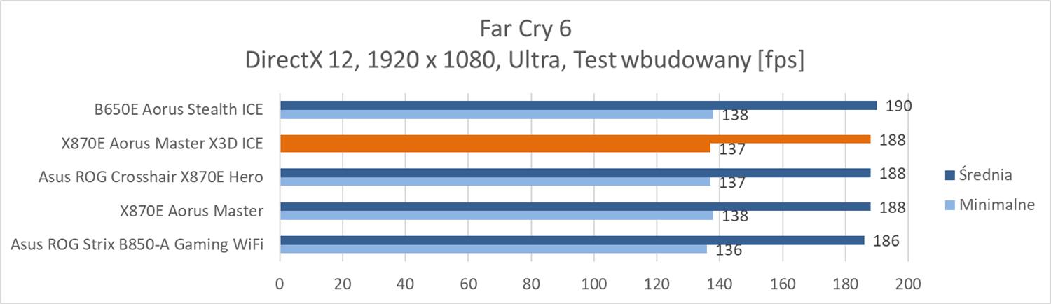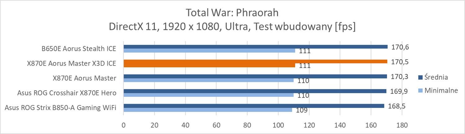 Na koniec przeprowadziłem testy w trzech grach: Total War: Phraorah, Assassin’s Creed Mirage oraz Far Cry 6. Testy wykonałem w rozdzielczości 1920 x 1080 px przy najwyższych ustawieniach. Wyłączyłem tylko ray tracing oraz DLSS/FSR, jeśli dana gra miała takie opcje. Testy przeprowadziłem przy wykorzystaniu wbudowanych w gry benchmarków. W przypadku Total War był to benchmark battle.