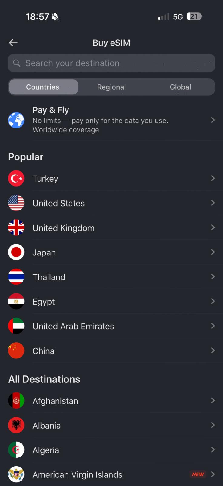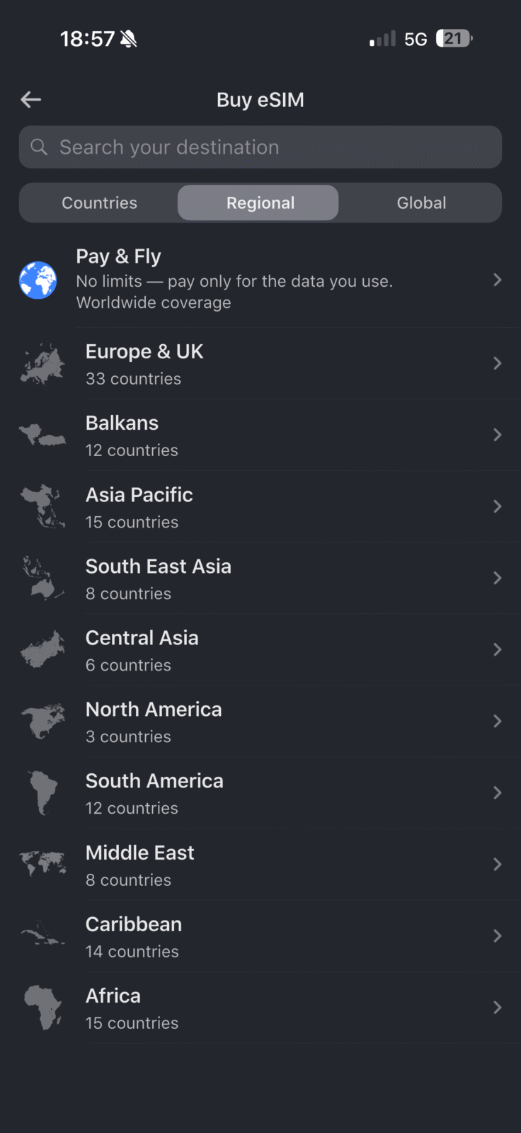 Zasięg robi wrażenie. Yesim chwali się dostępnością w ponad 200 krajach i regionach, z planami lokalnymi, regionalnymi (np. Europa, Azja, Ameryka Północna) oraz globalnymi. Do tego dochodzą pakiety o stałej pojemności danych oraz opcje nielimitowane (z typową dla takich rozwiązań polityką Fair Use, która po zużyciu określonej puli może przyciąć prędkość), a także model Pay & Fly — eSIM, którą instalujemy raz, a potem tylko doładowujemy dane w ponad 170 krajach, płacąc za to, co realnie zużyjemy, z ważnością środków nawet do 12 miesięcy.