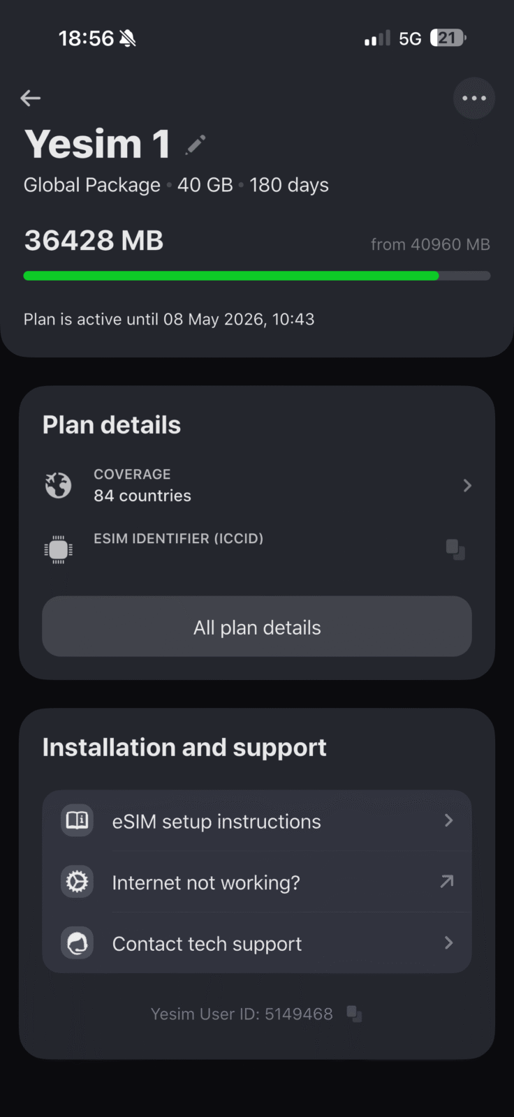 Na plus jest też to, że Yesim ma aplikację po polsku, działa na iOS i Androidzie, a w razie problemów oferuje całodobową obsługę klienta i dość prostą politykę zwrotów (30 dni na rezygnację z niewykorzystanego planu). Ja, z racji na podróże na dwa różne kontynenty, wybrałem plan globalny na 40 GB (a dokładnie 40960 MB, więc prawie 41 GB) o ważności 180 dni.