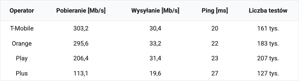 Za takimi wynikami stoją głównie Orange i T-Mobile. Ten drugi został liderem w 2025 roku z wynikiem 303,2 Mb/s. Orange ma niewielką stratę i średnia pomiarów za cały rok to 295,6 Mb/s. Play miał opóźnienia w rozbudowie sieci, ale coraz mocniej goni liderów i rok zamknął z wynikiem 206,4 Mb/s. Plus nie pali się do pogoni za wynikami oraz budowy sieci 5G w paśmie 3,6 GHz, w efekcie osiągając średnią prędkość na poziomie 113,1 Mb/s.