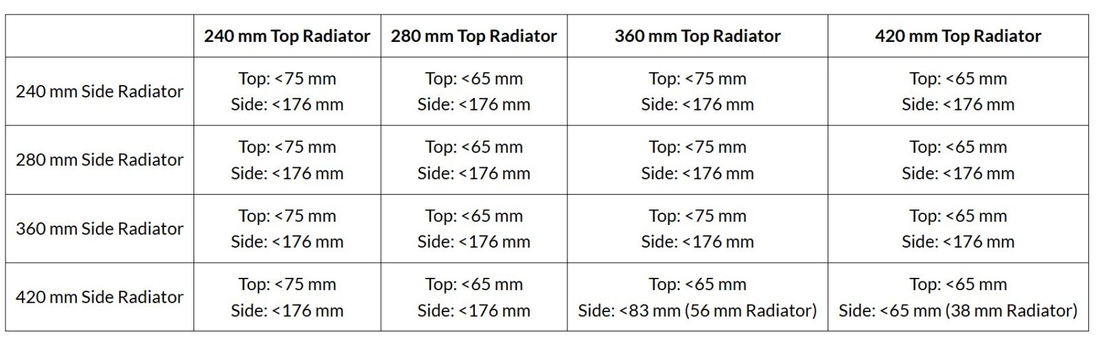 - Miejsca na chłodnicę: góra i bok: 240/280/360/420 mm