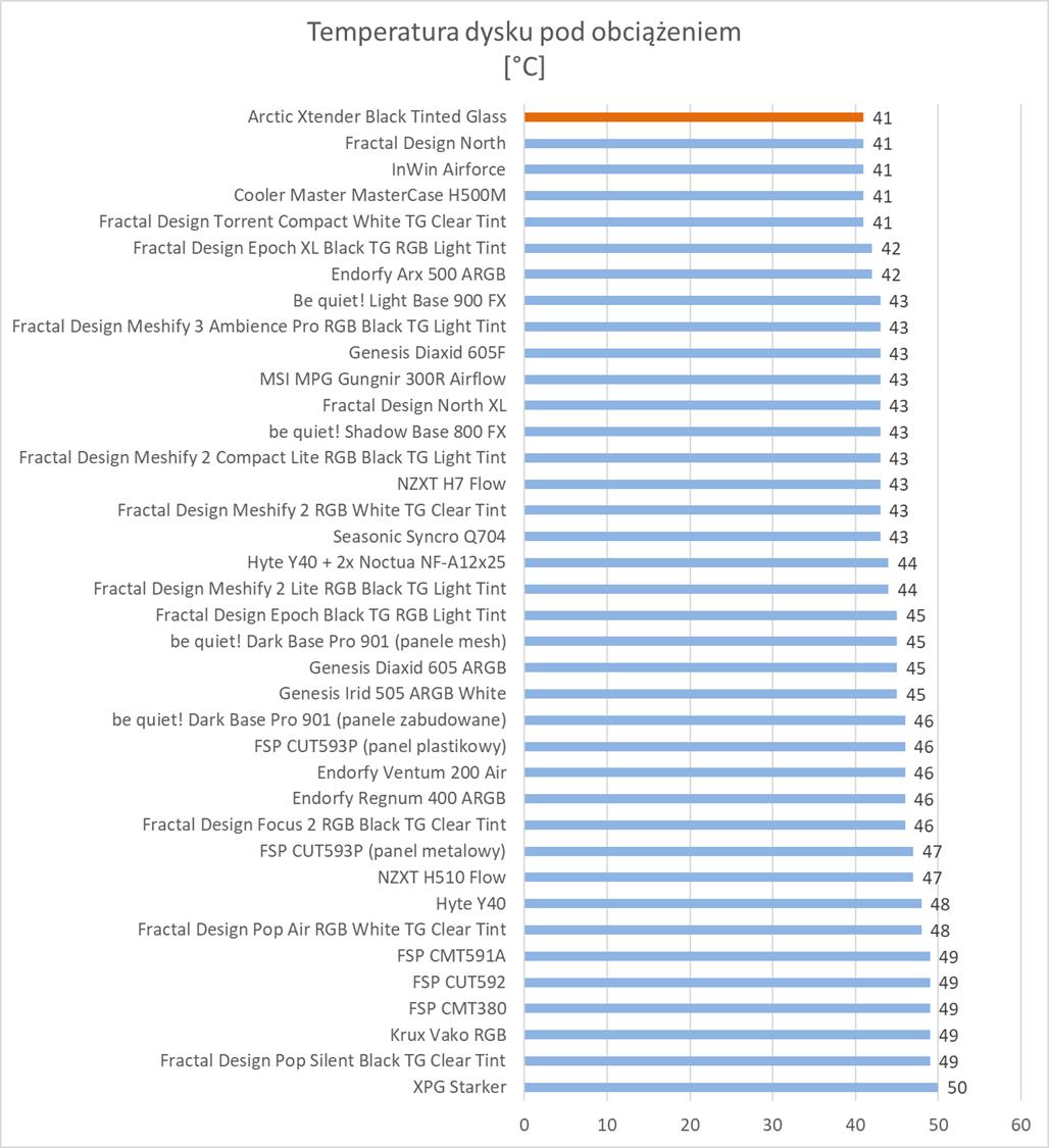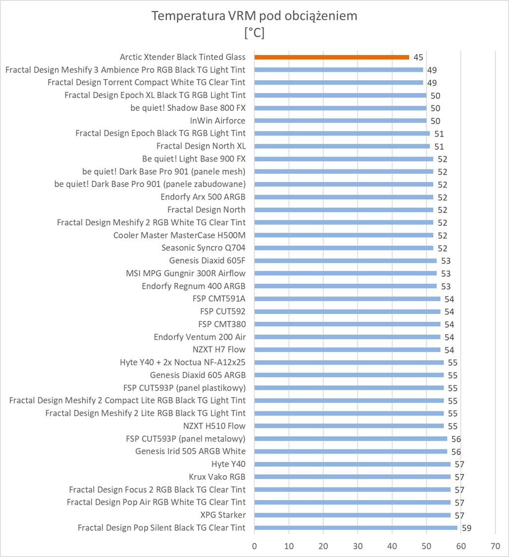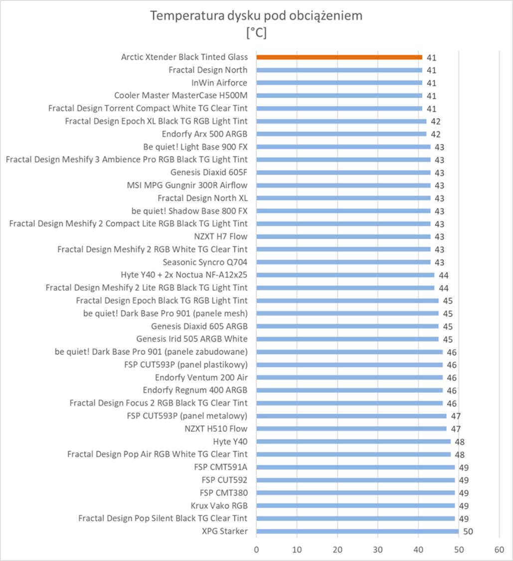 Pod względem temperatur mamy świetne wyniki. Temperatura procesora czy VRM jest niższa od najlepszych wyników do tej pory uzyskanych. Dysk wyrównuje rekord i mamy tylko trochę słabiej w przypadku karty graficznej – tu do lidera brakuje 3°C. Są to jednak świetne wyniki i widać, że podzespoły mają znakomite chłodzenie. Niestety jednak wentylatory są bardzo głośne na maksymalnych obrotach. Pod tym względem obudowa wypada najsłabiej spośród wszystkich testowanych modeli.
