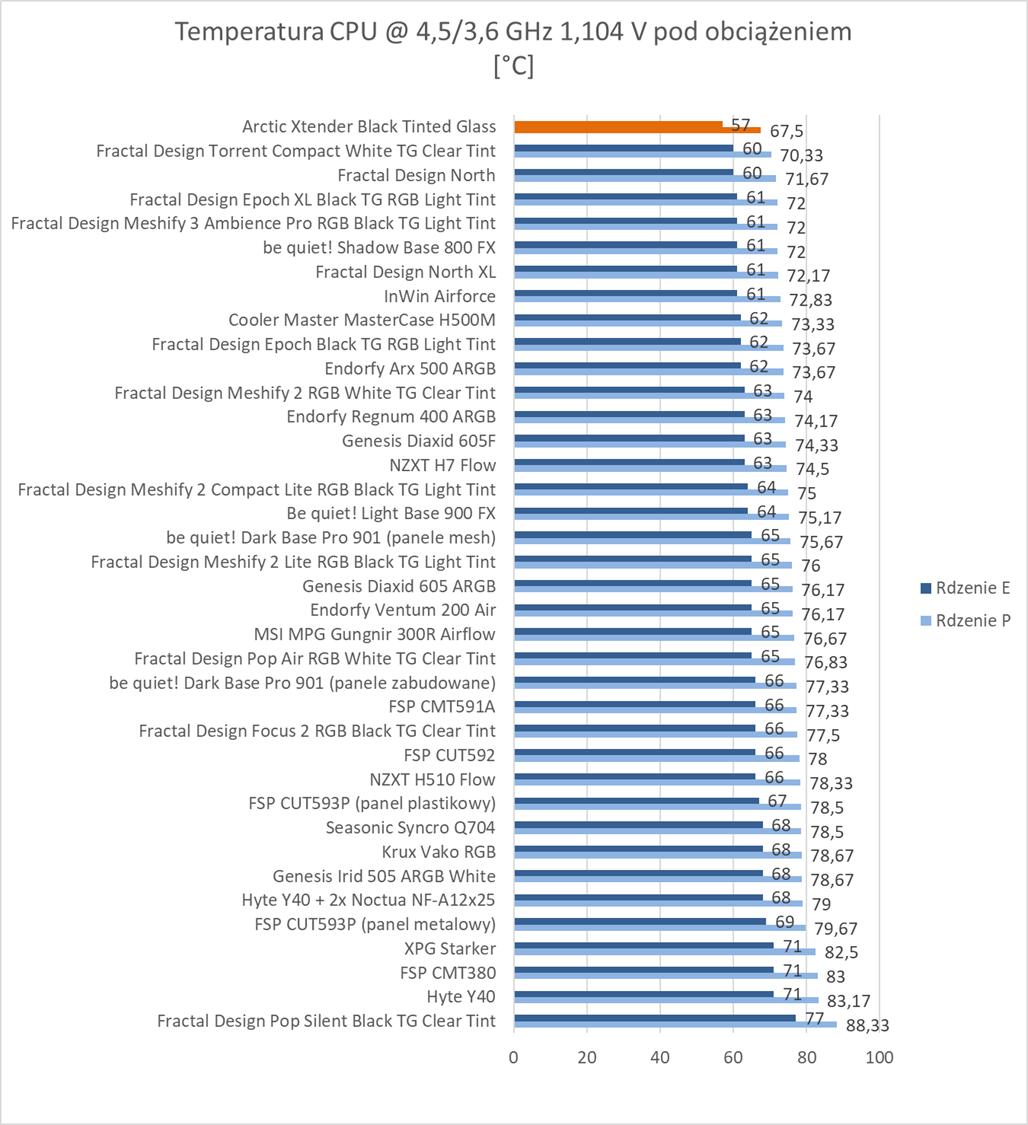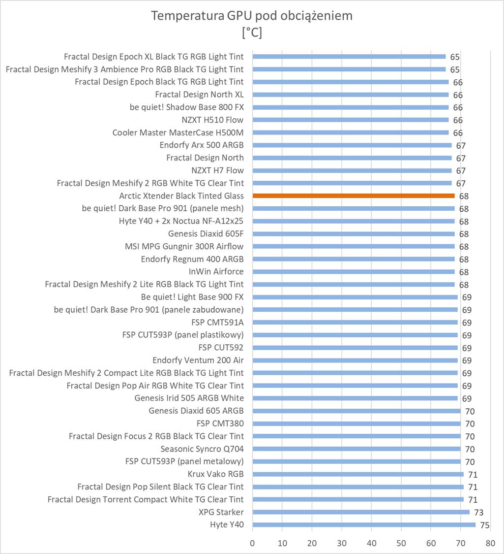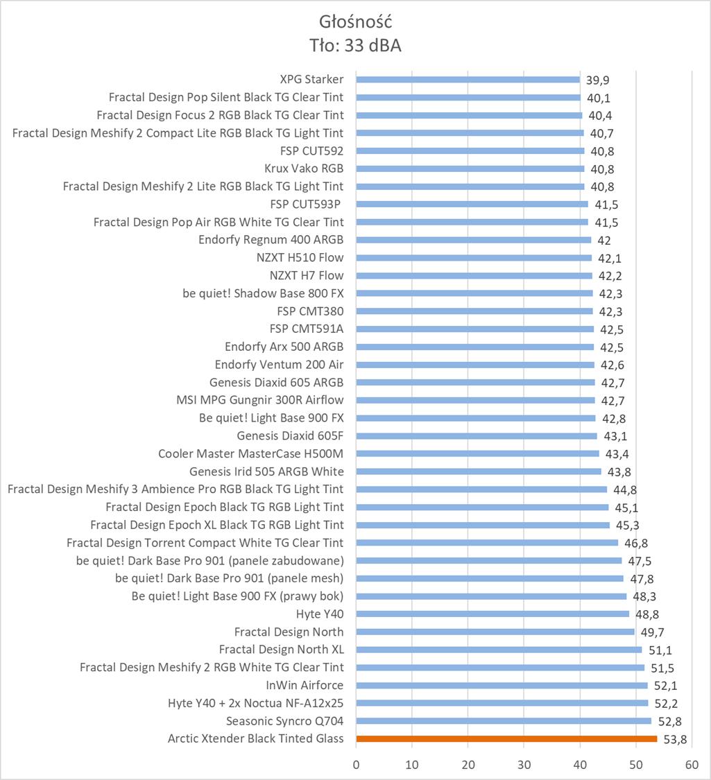 Pod względem temperatur mamy świetne wyniki. Temperatura procesora czy VRM jest niższa od najlepszych wyników do tej pory uzyskanych. Dysk wyrównuje rekord i mamy tylko trochę słabiej w przypadku karty graficznej – tu do lidera brakuje 3°C. Są to jednak świetne wyniki i widać, że podzespoły mają znakomite chłodzenie. Niestety jednak wentylatory są bardzo głośne na maksymalnych obrotach. Pod tym względem obudowa wypada najsłabiej spośród wszystkich testowanych modeli.