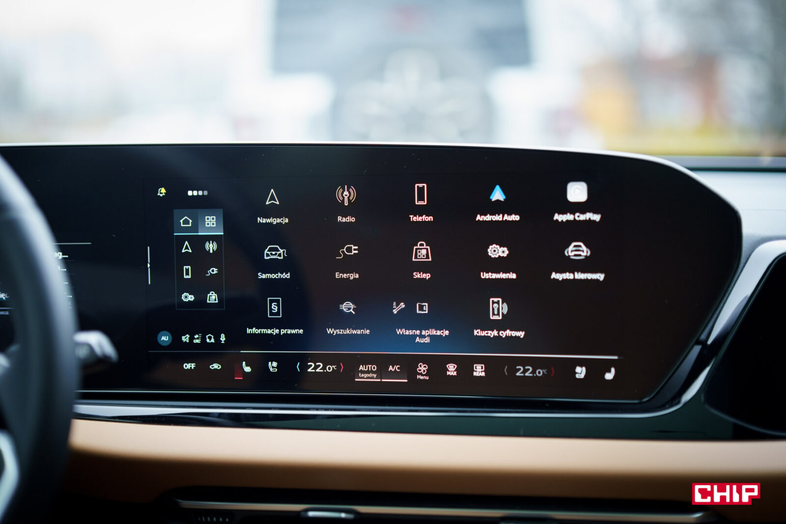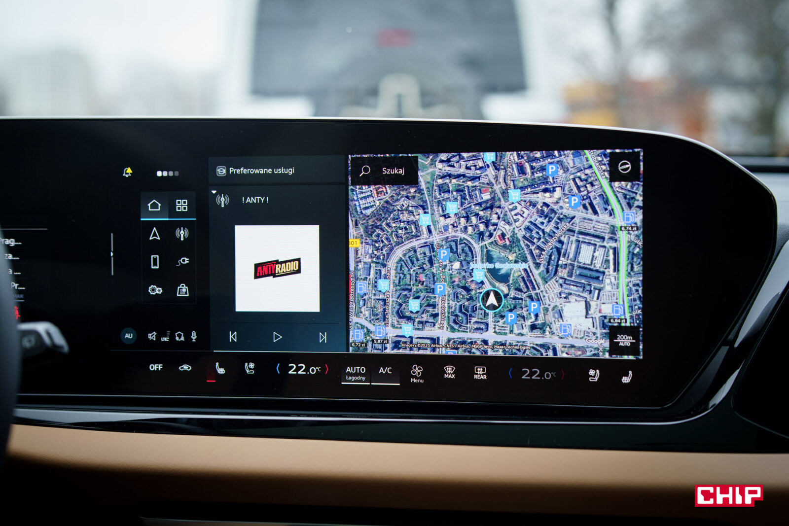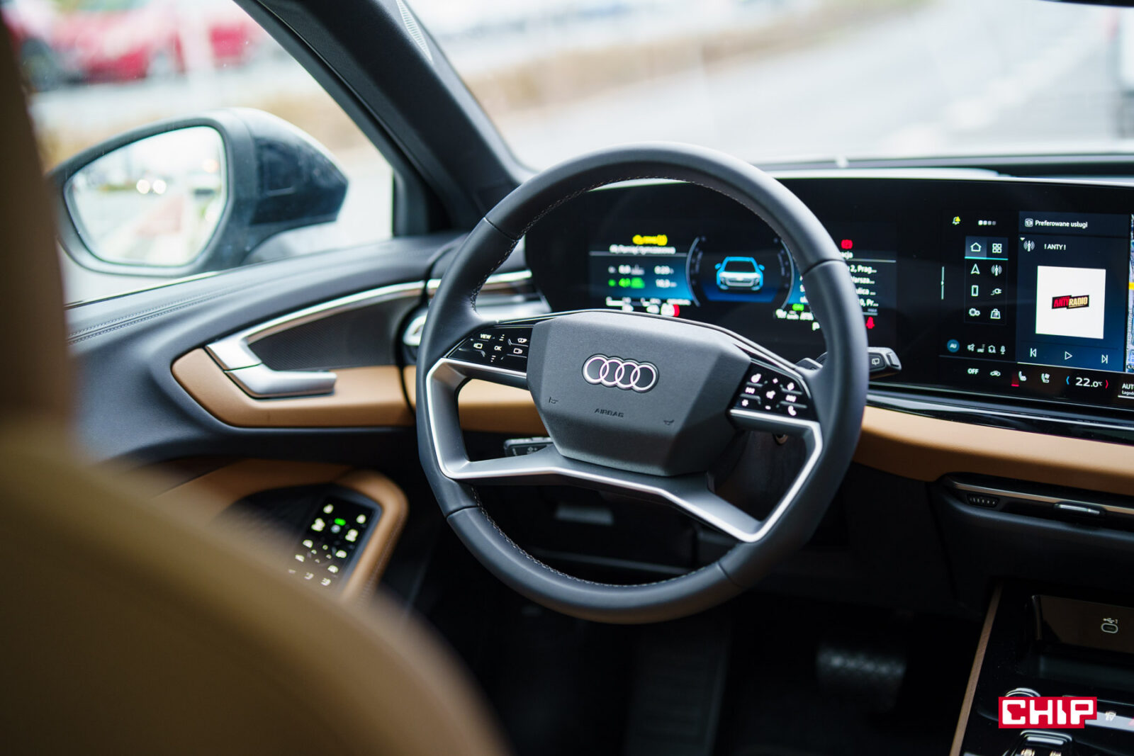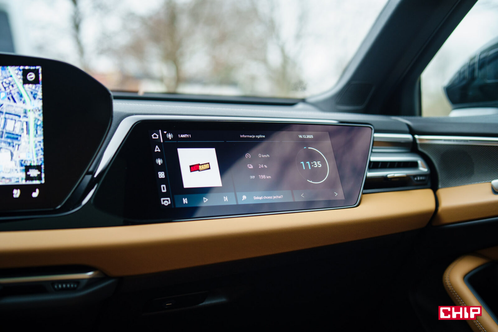 Ekran kierowcy… jest. Niezmiennie narzekam, że Audi nie daje możliwości personalizowania go w większy sposób. Do dyspozycji mamy widok z opcją zmiany informacji wyświetlanych po bokach głównego zegara lub bardziej rozszerzony widok pokazujące działanie asystentów oraz cyfrowy widok drogi wokół nas. Co ciekawe, możemy tam wyświetlić Mapy, o ile są to Mapy Apple. Jeśli korzystamy z Apple CarPlay (działa bezprzewodowo, jak Android Auto) i Map Google, to dostęp do nich mamy tylko na ekranie głównym.