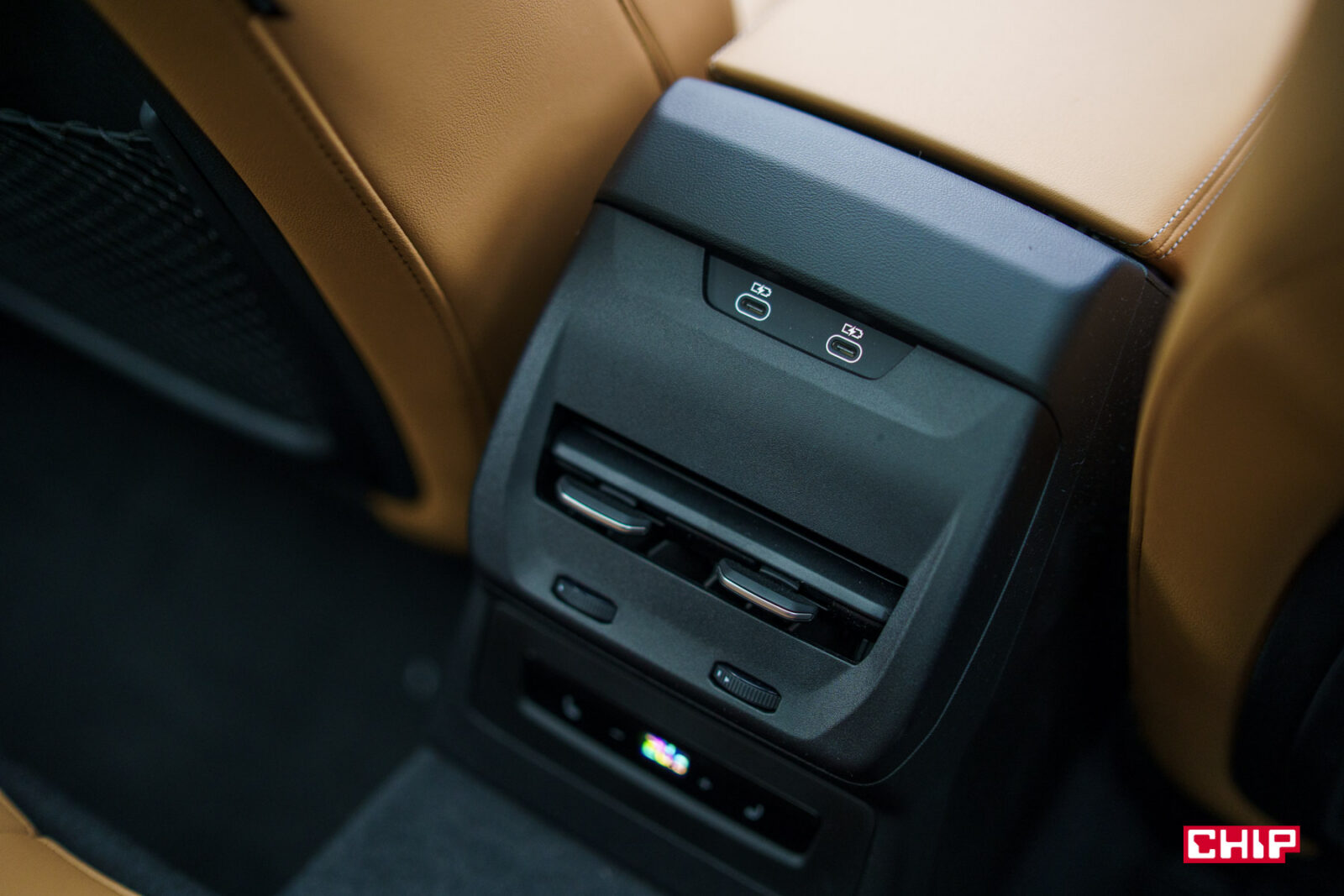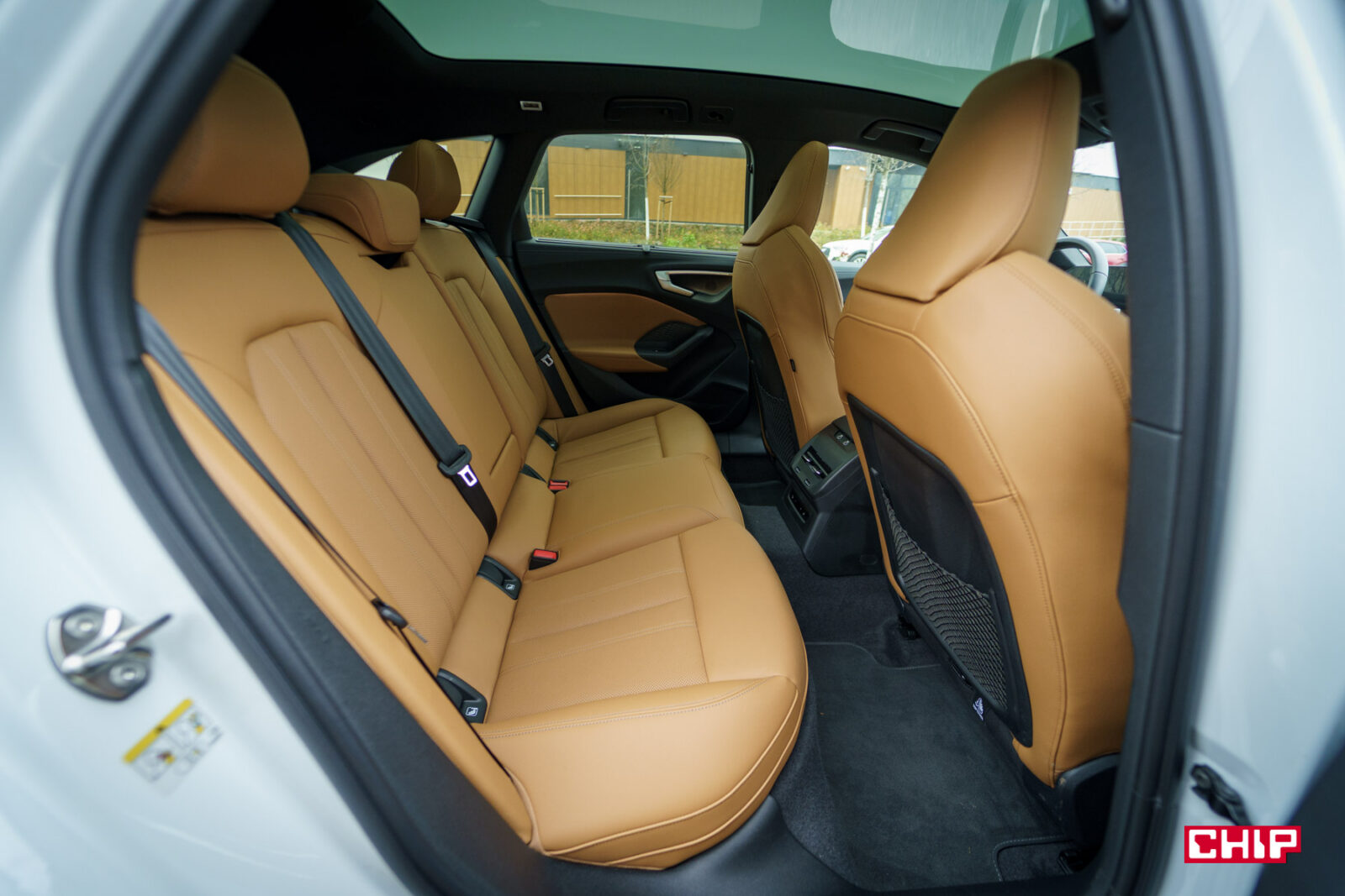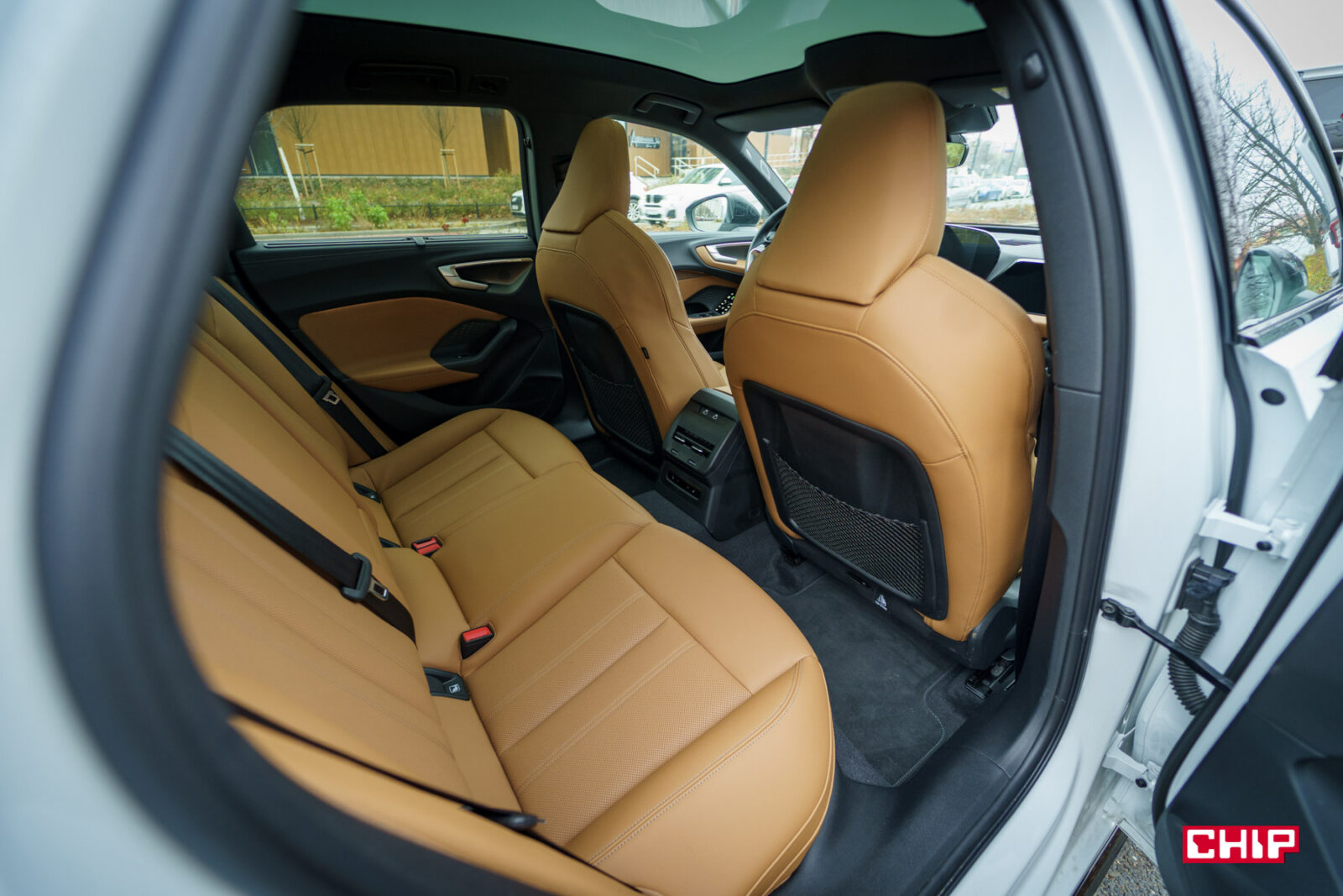 Na tylnej kanapie jest bardzo komfortowo, o ile podróżujemy tam w maksymalnie dwie osoby. Jest głęboko osadzona, dzięki czemu mamy dużo miejsca nad głową. Nie brakuje go też przed nami. Sama kanapa jest miękka, może mieć podgrzewane skrajne miejsca, a do dyspozycji mamy też dwa porty USB-C oraz panel sterowania klimatyzacją. Podróżuje się tu bardzo wygodnie. Nad głową możemy mieć panoramiczny dach ze zmiennym stopniem przezroczystości. Możemy przyciemnić całość, połowę, albo część tafli szkła, co wygląda trochę jak żaluzja dzień-noc.