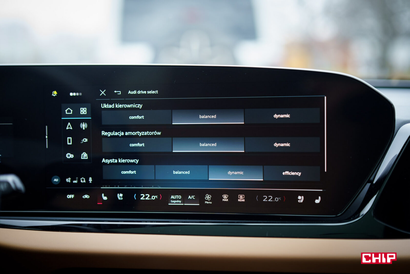 Większość hybryd plug-in ma przeróżne tryby pracy – EV, tryb hybrydowy, tryb utrzymania baterii, tryb ładowania baterii. W A5 mamy tylko 2 tryby: EV (jazda na samym prądzie) oraz tryb hybrydowy. Kwestię zachowania prądu oraz ładowania załatwiono w genialnie prosty sposób: w ustawieniach auta mamy suwak. Jeżeli nie chcemy, aby auto zużywało prąd, wystarczy przesunąć go na aktualny poziom naładowania baterii. Jeżeli chcemy ją doładować podczas jazdy, ustawiamy suwak na % naładowania, który nas interesuje. Auto będzie wtedy spalało więcej paliwa, ale będzie ładowało baterię w zaskakująco szybkim tempie. Kiedy jechaliśmy ekspresówką z tempomatem ustawionym na 120 km/h, po przejechaniu 25 km, bateria doładowała się o 13%. Spalanie podskoczyło o 2l/100 km, ale jeżeli przed Wami długa droga na końcu której macie miasto, opcja doładowania baterii po trasie może być bardzo przydatna.