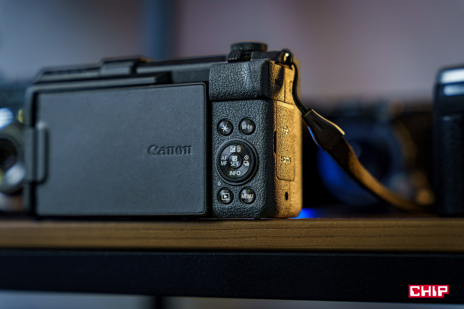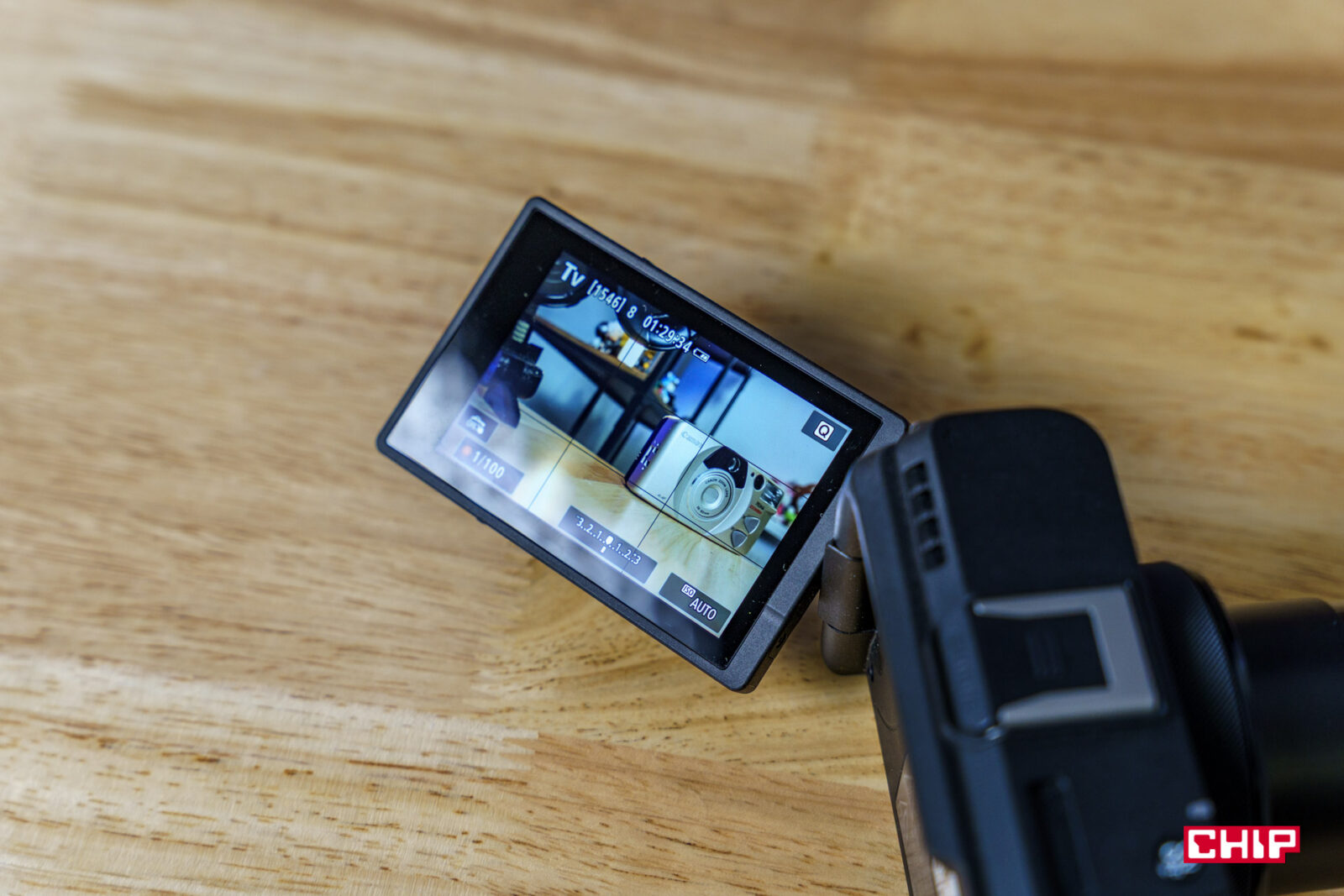 Canon PowerShot V1 jest wyposażony w 3-calowy ekran dotykowy o rozdzielczości 1,04 mln punktów z 5-stopniową regulacją jasności. Jest odchylany i obracany, klasycznie dla Canona… krzywo. Czyli po otwarciu nie jest on ustawiony równolegle do obudowy, tylko delikatnie od niej odstaje. Canon już tak ma i trzeba się do tego przyzwyczaić.