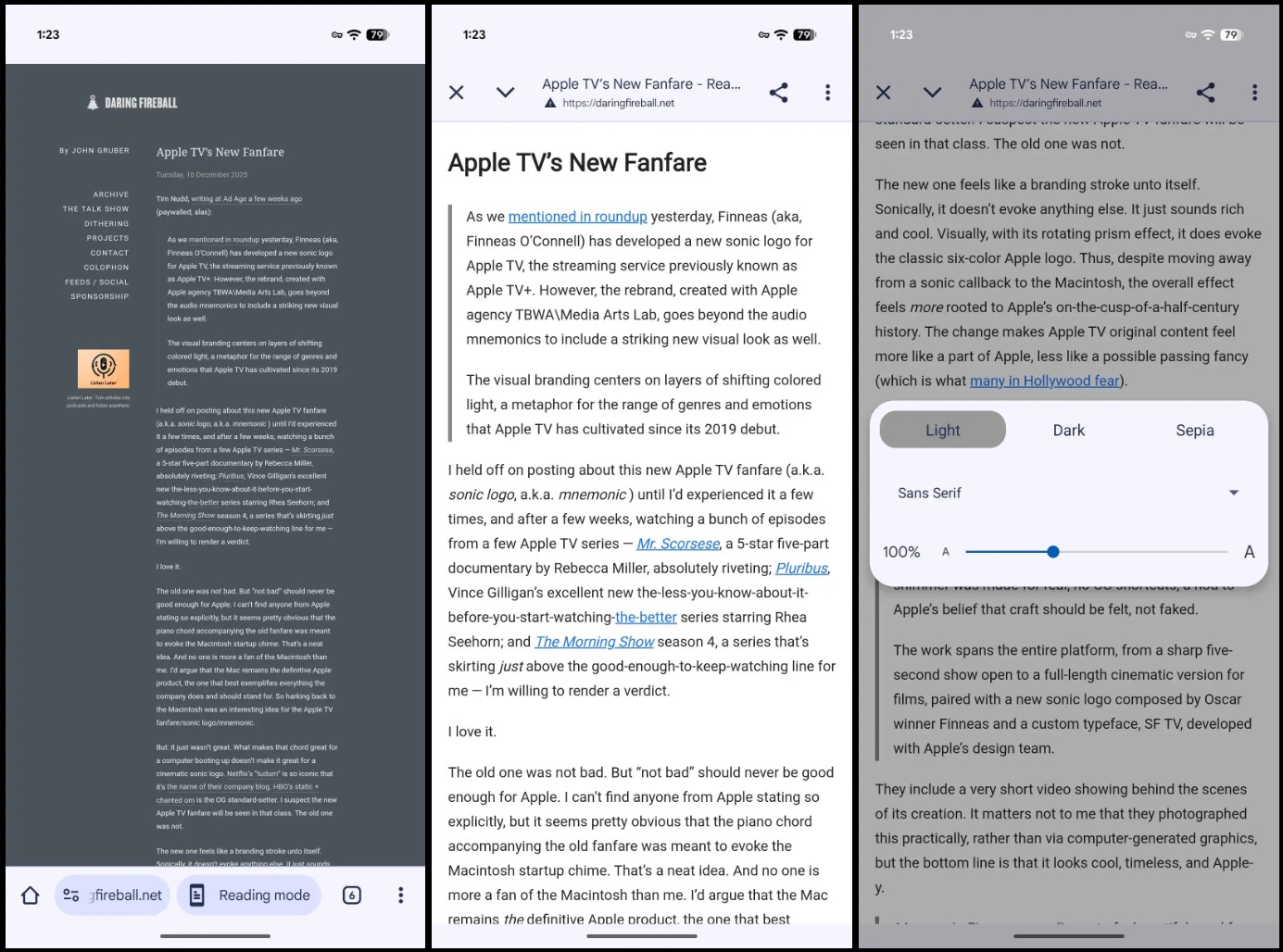 Zmiana dotknęła nie tylko lokalizacji, ale i sposobu działania interfejsu. Wcześniej przejście w tryb czytania oznaczało całkowite przełączenie się na nową, pełnoekranową widokówkę, co odcinało nas od paska adresu i reszty nawigacji. Nowa wersja działa bardziej jak nakładka – pasek adresu pozostaje na swoim miejscu, a ty czujesz, że wciąż jesteś w przeglądarce, a nie w osobnej aplikacji.