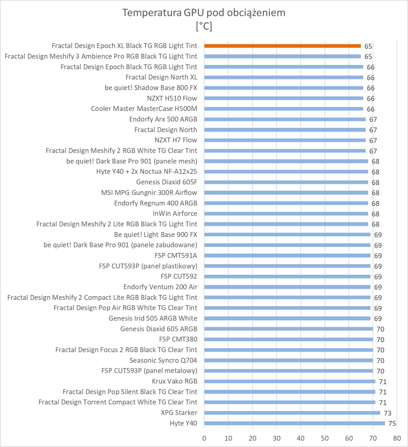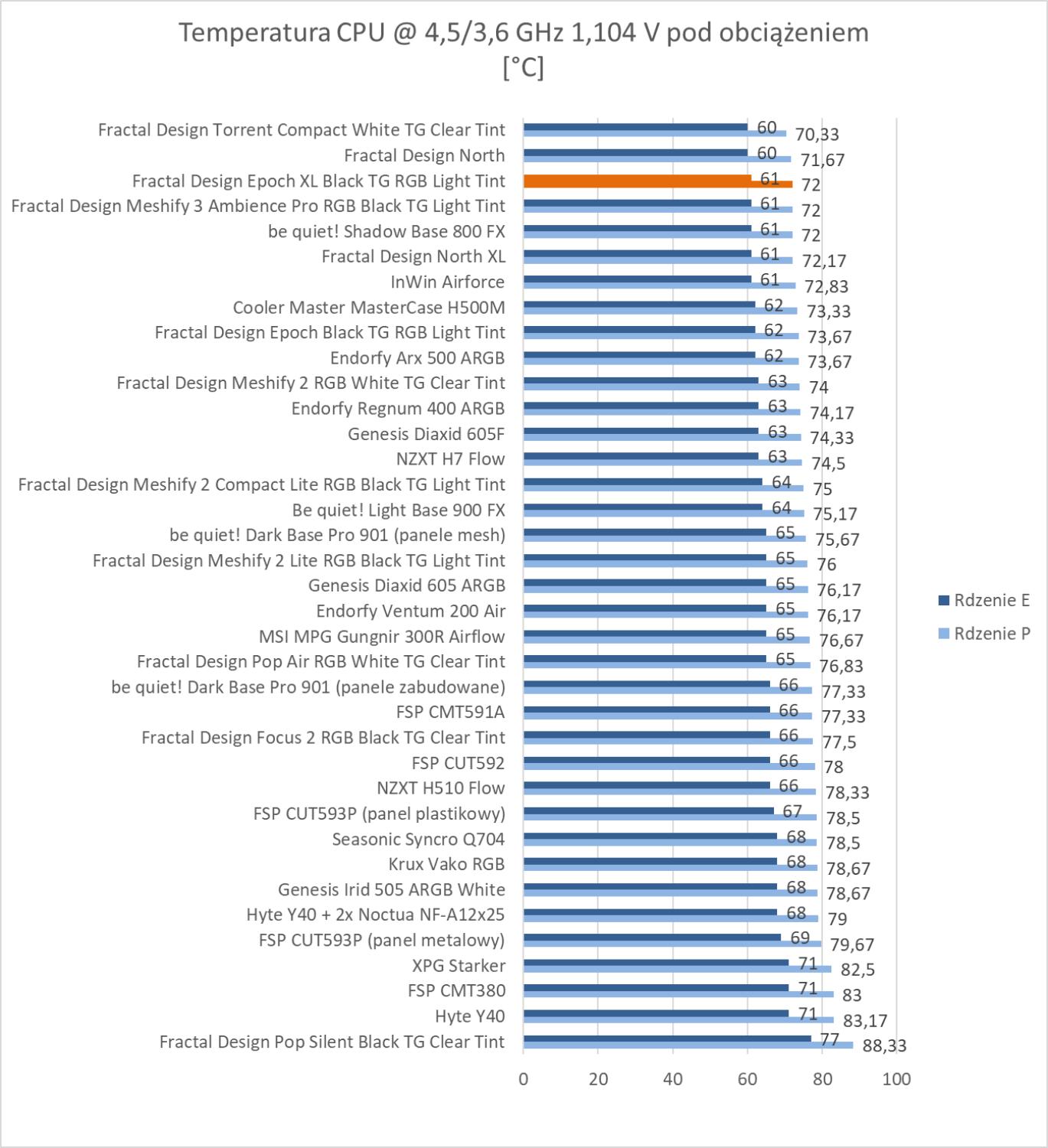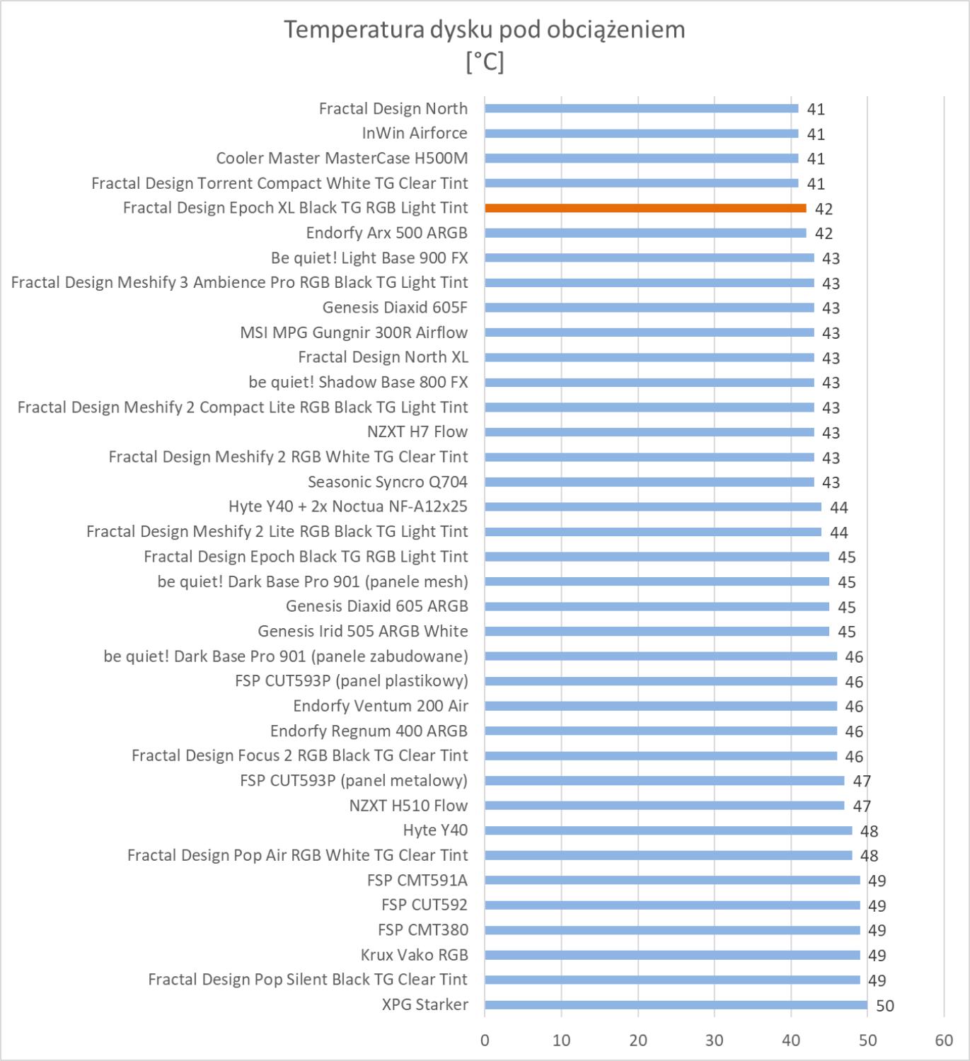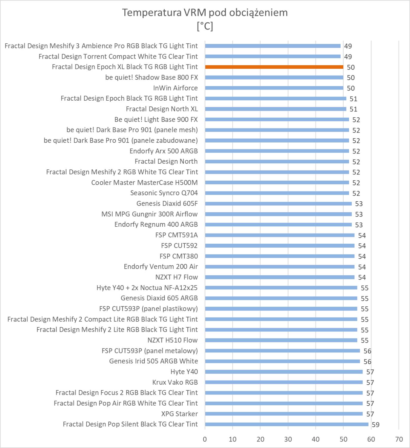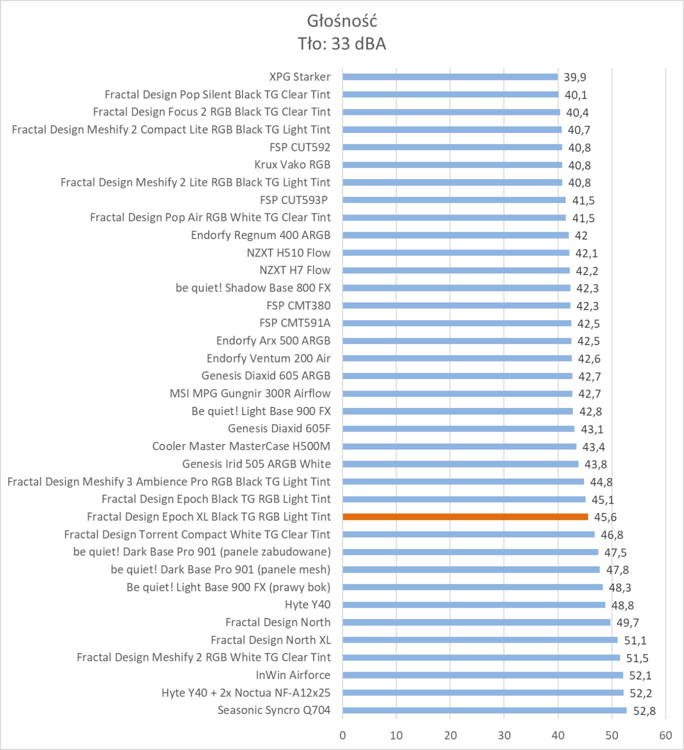 Obudowa wypada świetnie w testach. Wyniki są podobne do Meshify 3, która również ma w zestawie 3 te same wentylatory. Rezultaty są też lepsze niż w przypadku zwykłej wersji Epoch. We wszystkich testach temperatur obudowa znajduje się w czołówce wyników, więc bez wątpienia podzespoły mają świetne warunki do pracy. Pod względem głośności jest też dobrze biorąc pod uwagę trzy śmigła 140 mm pracujące na 1800 RPM.