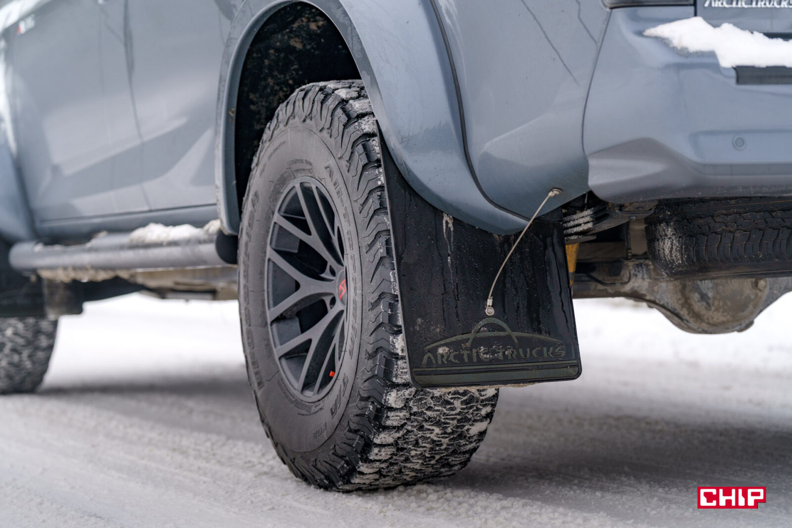 Co obejmują modyfikacje wprowadzone przez Arctic Trucks? Pod względem wizualnym są to 17-calowe felgi i opony terenowe 315/70. Nadkola są potężnie poszerzone, gdzieś te opony trzeba zmieścić i zostały polakierowane. Zmodyfikowane są też stopnie boczne, zderzak, błotniki i nadkola są trymowane oraz zainstalowane zostały chlapacze. Trochę to pomaga, ale i tak jadąc mokrą drogą za tym bydlakiem będzie na Was chlapać jak spod Tira.