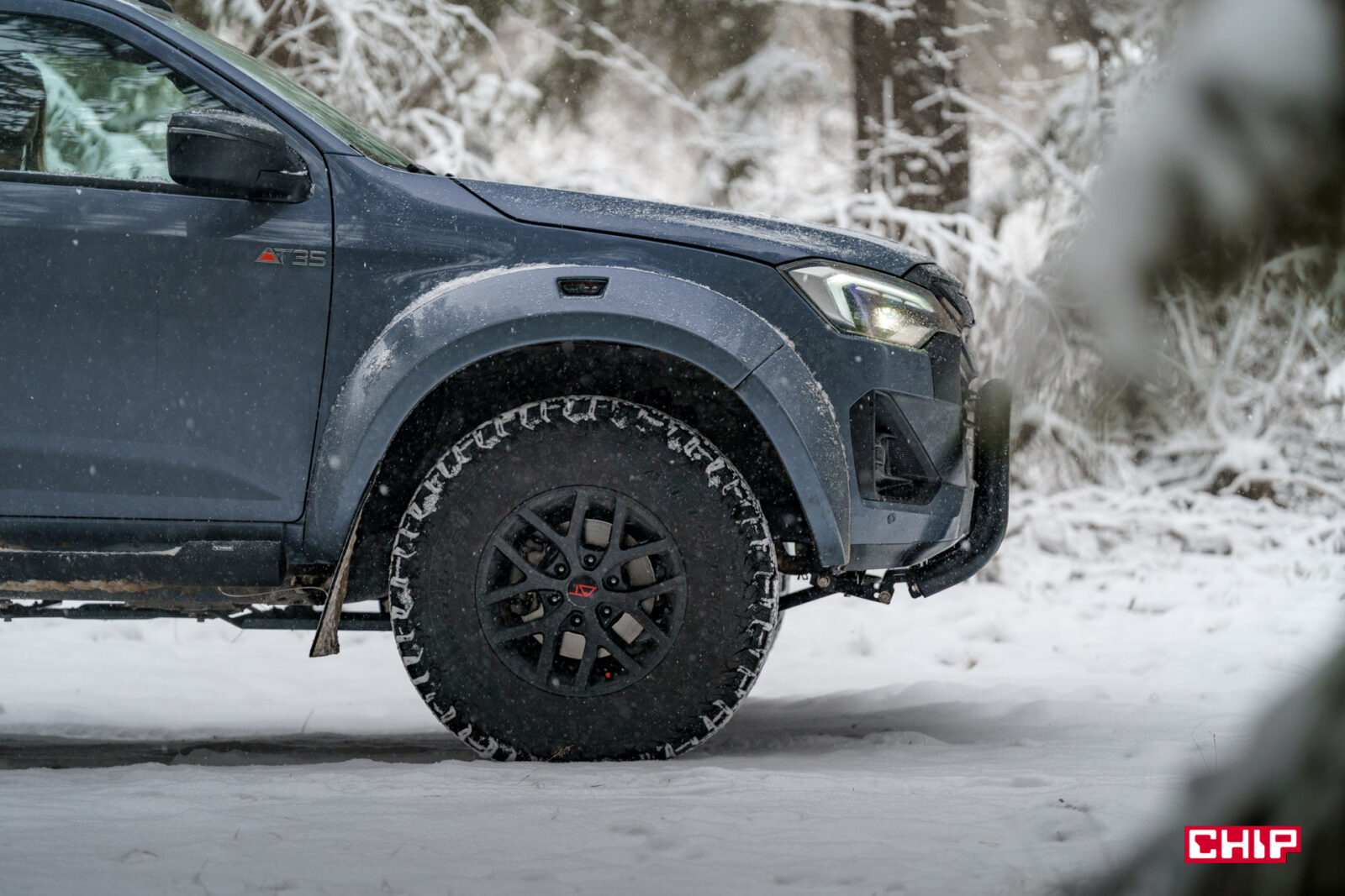 Zacznijmy od wymiarów, które po modyfikacjach wynoszą 5 265 mm długości, 2 040 mm szerokości i 1 875 mm wysokości, a rozstaw osi to 3 125 mm. Patrząc na długość i szerokość – to nie jest dużo. Ale w połączeniu z tą wysokością i ogólną masywnością auta, Isuzu D-Max Arctic Trucks wydaje się o połowę większy. No ok, może 30%.