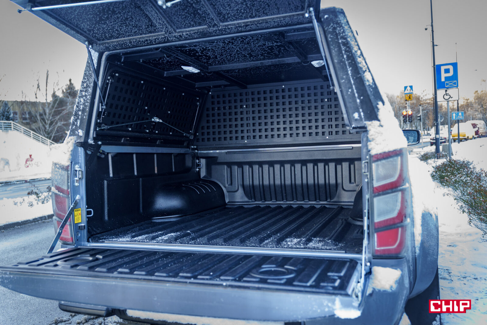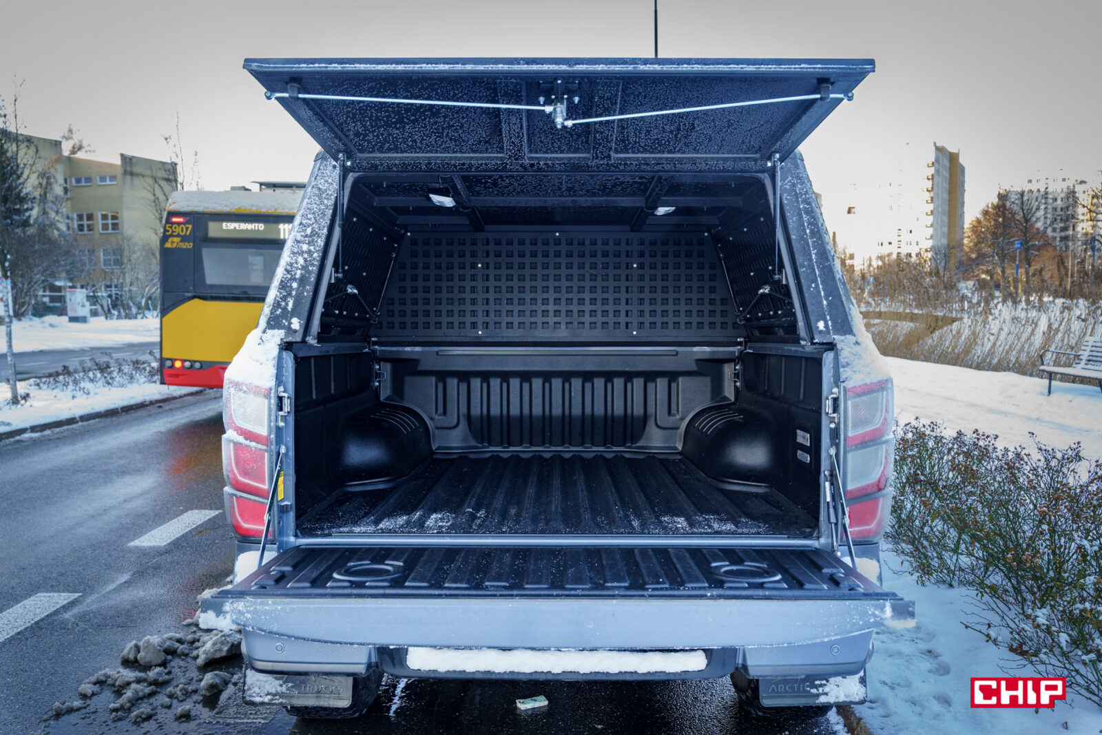 Zabudowa paki jest wykonana z solidnego metalu. Do środka możemy się dostać z tyłu, ale też po bokach. Klapy otwierają się do góry, ale bocznych niestety Wam nie pokażemy, bo… zamarzły w nich zamki. I tak, każda z klap ma osobny, klasyczny zamek zamykany kluczem oraz do otwarcia wymaga przekręcenia mechanizmu, który śmiało możemy nazwać klamką.