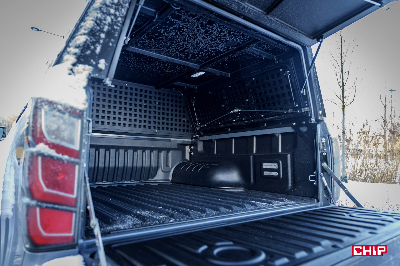 Wymiary wnętrza są różnie podawane i długość to 1 485 – 1 495 mm, wysokość 465 – 490 mm, a między nadkolami mamy 1 100 mm szerokości, więc mieści się tu europaleta. To, jak można wykorzystać zabudowę, zależy w zasadzie tylko od fantazji i pomysłowości właściciela auta.
