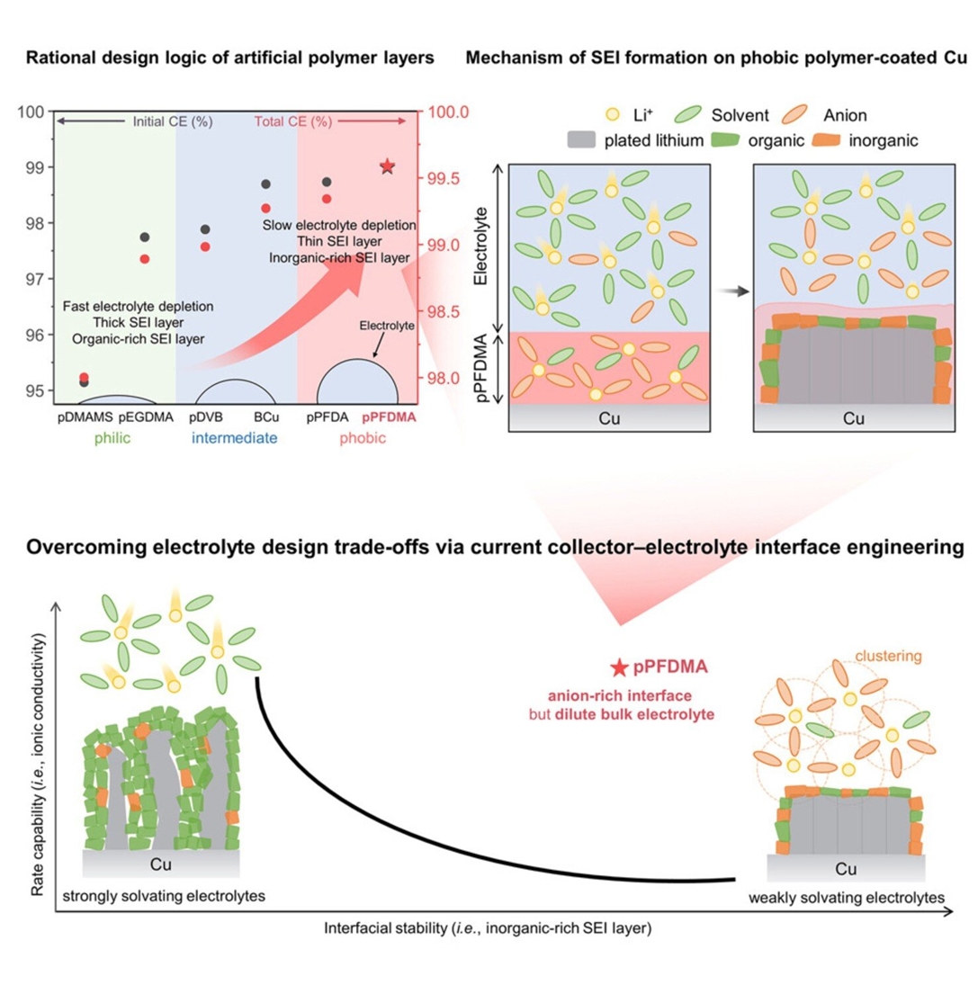 Zespół pod kierunkiem profesorów Jinwoo Lee i Sung Gap Im z Wydziału Inżynierii Chemicznej i Biomolekularnej skupił się na podstawowym problemie bezanodowych akumulatorów litowo-metalowych. Chodzi o niestabilną granicę między elektrolitem a miedzianym kolektorem prądu, który w tych ogniwach zastępuje anodę. Podczas pierwszego ładowania lit osadza się bezpośrednio na miedzi, co prowadzi do gwałtownego zużycia elektrolitu i powstania niestabilnej warstwy SEI (stały interfejs elektrolitu). To z kolei sprzyja powstawaniu dendrytów, mikroskopijnych igieł litu, które ostatecznie powodują awarię ogniwa.
