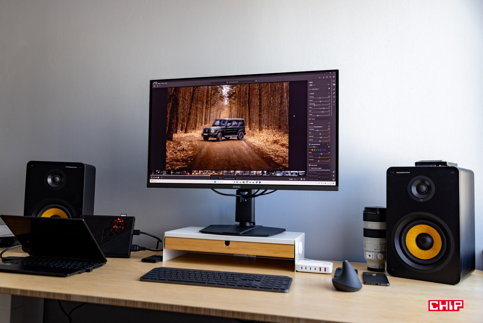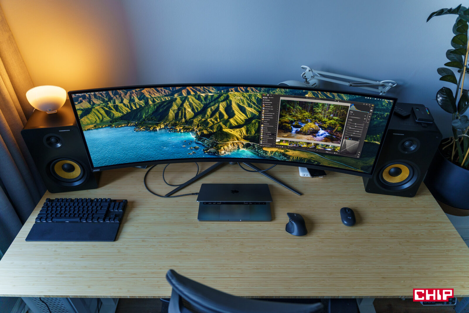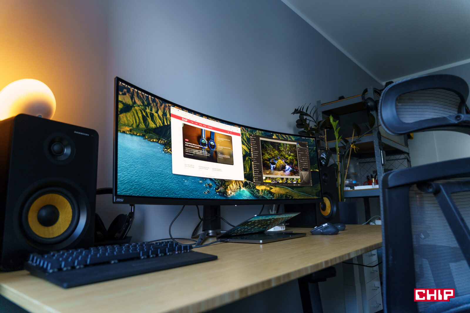 MSI MPG 491CQP QD-OLED to genialny ekran. Topowa jakość obrazu, wysokie pokrycie palety kolorów, sprawdza się zarówno przy pracy, jak i przy grach. Tak, znam narzekanie na monitory 32:9, natomiast praktycznie nie zdarza mi się korzystać z niczego, co wymaga dużej przestrzeni w pionie. Do montowania wideo – idealny. Do zdjęć – prawie. Prawie, bo na pełnym ekranie zdjęciom potrafi brakować rozdzielczości i o ile nie używasz 100 Mpix Hasselblada lub Fujifilm, albo Sony A7R V, lepiej brać się za edycję w mniejszym oknie. A jeśli kogoś zastanawia, czy taki ekran nie jest za duży to naprawdę wszystko zależy od biurka. Jeśli jest bardzo duże to ten ekran jest w sam raz. Na 140 cm szerokości lub mniejszym nawet nie próbowałbym go ustawiać. Chyba że z opcją powieszenia na ścianie.