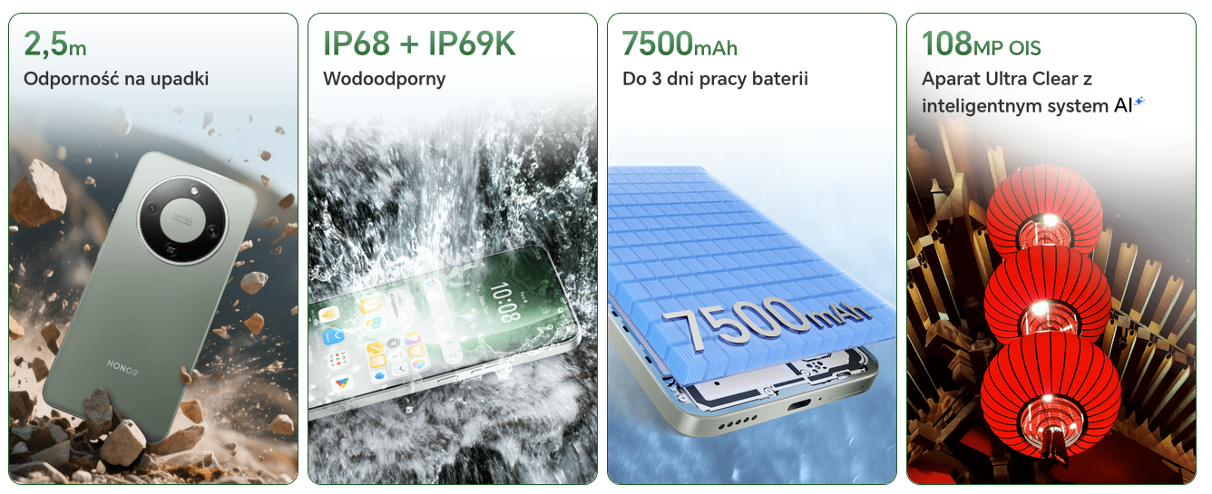 Nawet wchodząc na stronę internetową Honora, pierwszymi wymienianymi cechami modelu Magic8 Lite jest odporność na upadki z wysokości 2,5 metra, następnie zgodność z normą IP68 oraz IP69K, a dopiero na kolejnym miejscu mamy mocarną baterię 7500 mAh, aparat 108 Mpix czy funkcje AI. Do tego Honor chwali się pierwszym w branży certyfikatem SSG Triple-Resistant Premium Performance. Przyznaję bez bicia, że nie mam zielonego pojęcia co to jest, więc pogrzebałem w sieci, żeby się dowiedzieć, czy to faktycznie jest coś, co można uznać za potwierdzenie odporności smartfonu.