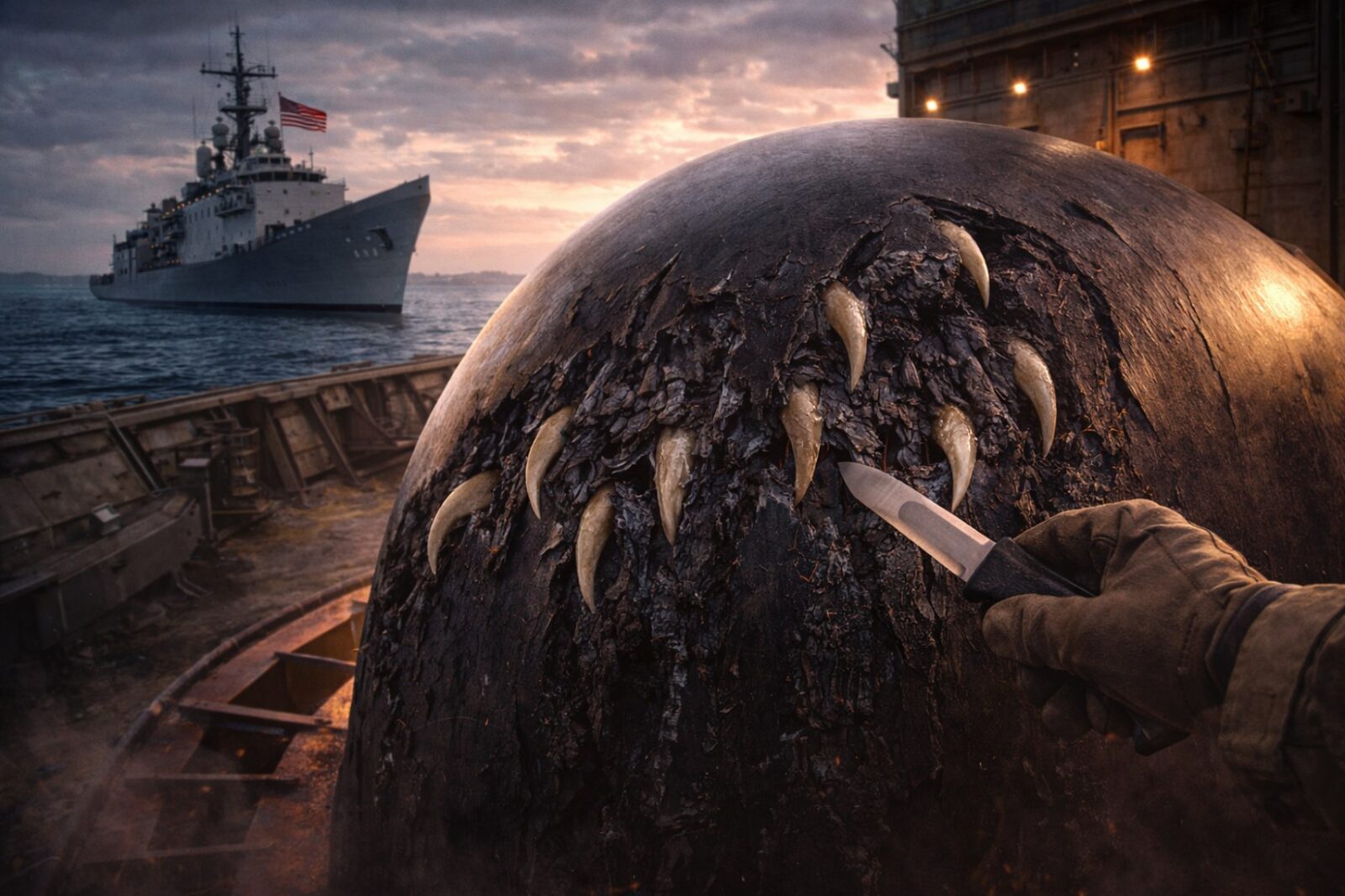 Drugą warstwą zagadki jest sama technologia. Sonarowa kopuła okrętu była pokryta specjalną, elastyczną powłoką, która miała tłumić szumy i poprawiać czułość systemu. W normalnych warunkach taka guma jest odporna zarówno na ciśnienie, jak i na drobne uszkodzenia mechaniczne. Fakt, że coś potrafiło nie tylko ją podziurawić, ale wręcz wyrwać z niej całe pasy materiału, świadczy o ogromnej sile uderzenia, powtarzalnym ruchu i niezwykłej budowie narzędzia ataku. Dla inżynierów to bezcenny, choć niepokojący eksperyment terenowy, bo oto okazało się, że nawet nowoczesna powłoka opracowana z myślą o ochronie sprzętu wojskowego może okazać się bezradna wobec biologicznego projektu, który ewoluował miliony lat z myślą o chwytaniu i rozdzieraniu mięsa, a nie gumy technicznej.