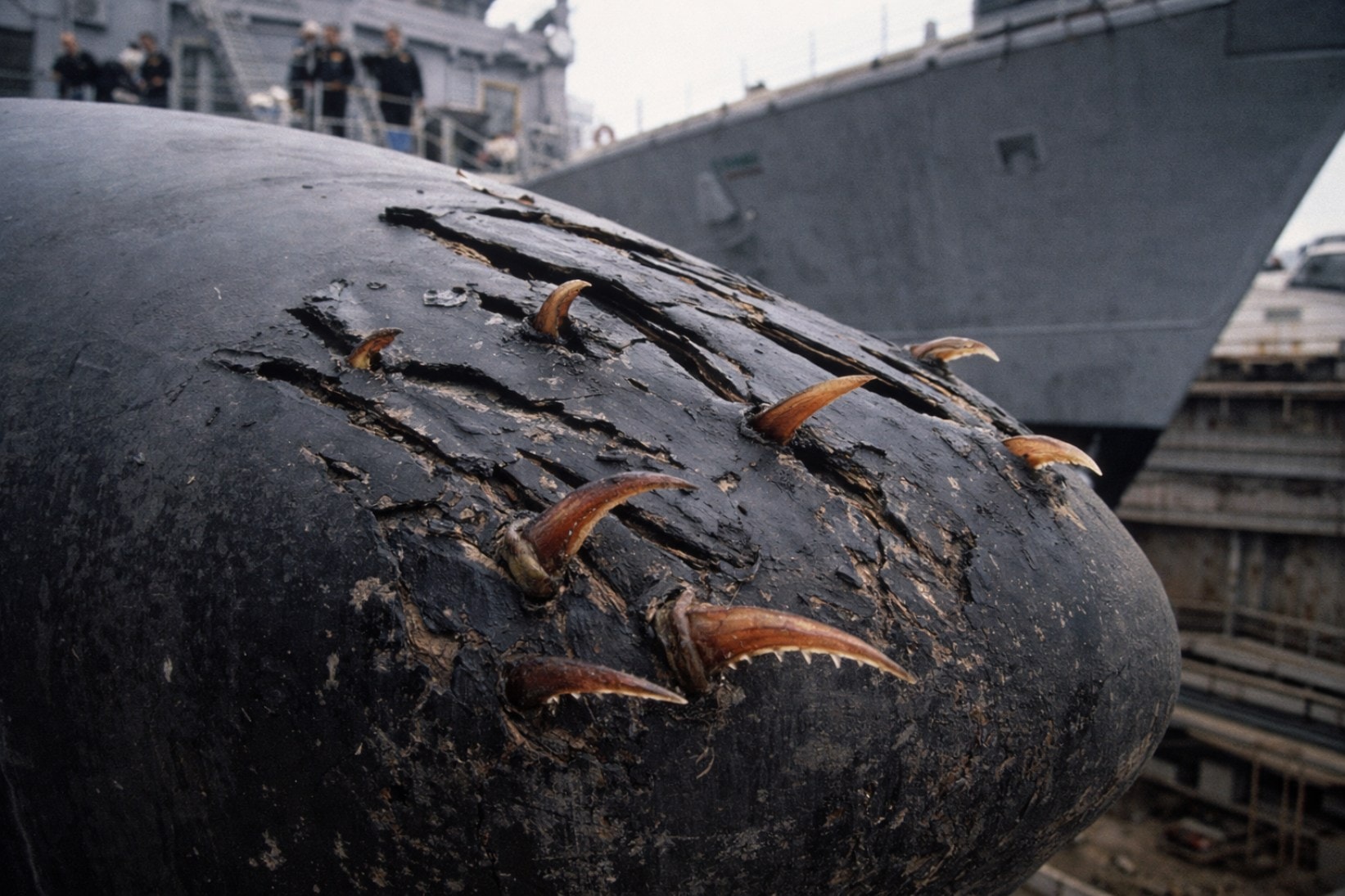 Po wpłynięciu do suchego doku, podoficer Ira Carpenter postanowił osobiście zbadać osłonę sonaru na kadłubie. Widok, który ujrzał, wprawił w zdumienie nawet doświadczonego marynarza. Gumowa powłoka była poryta dziesiątkami głębokich, ostrych nacięć, a w szczelinach tkwiły tajemnicze, przypominające zęby lub pazury fragmenty. Wywiad ten został nagrany.