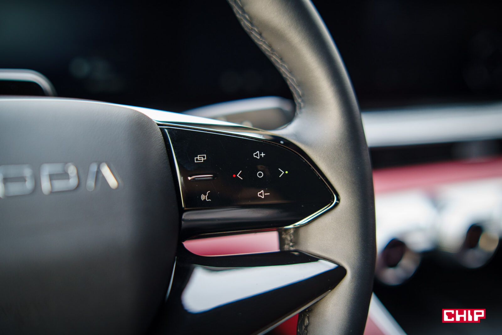 Skoro żadne z pokręteł nie reguluje głośności, to jak się ją zmienia? Tutaj ktoś wpadł na genialny pomysł i zrobił do tego dotykowe pola, umieszczone na przedziwnej grafice, co… wygląda jak wyżej. Na całe szczęście regulacja głośności jest też na kierownicy, bo dotykowe pola są umieszczone tak daleko od kierowcy, jak tylko było to możliwe.