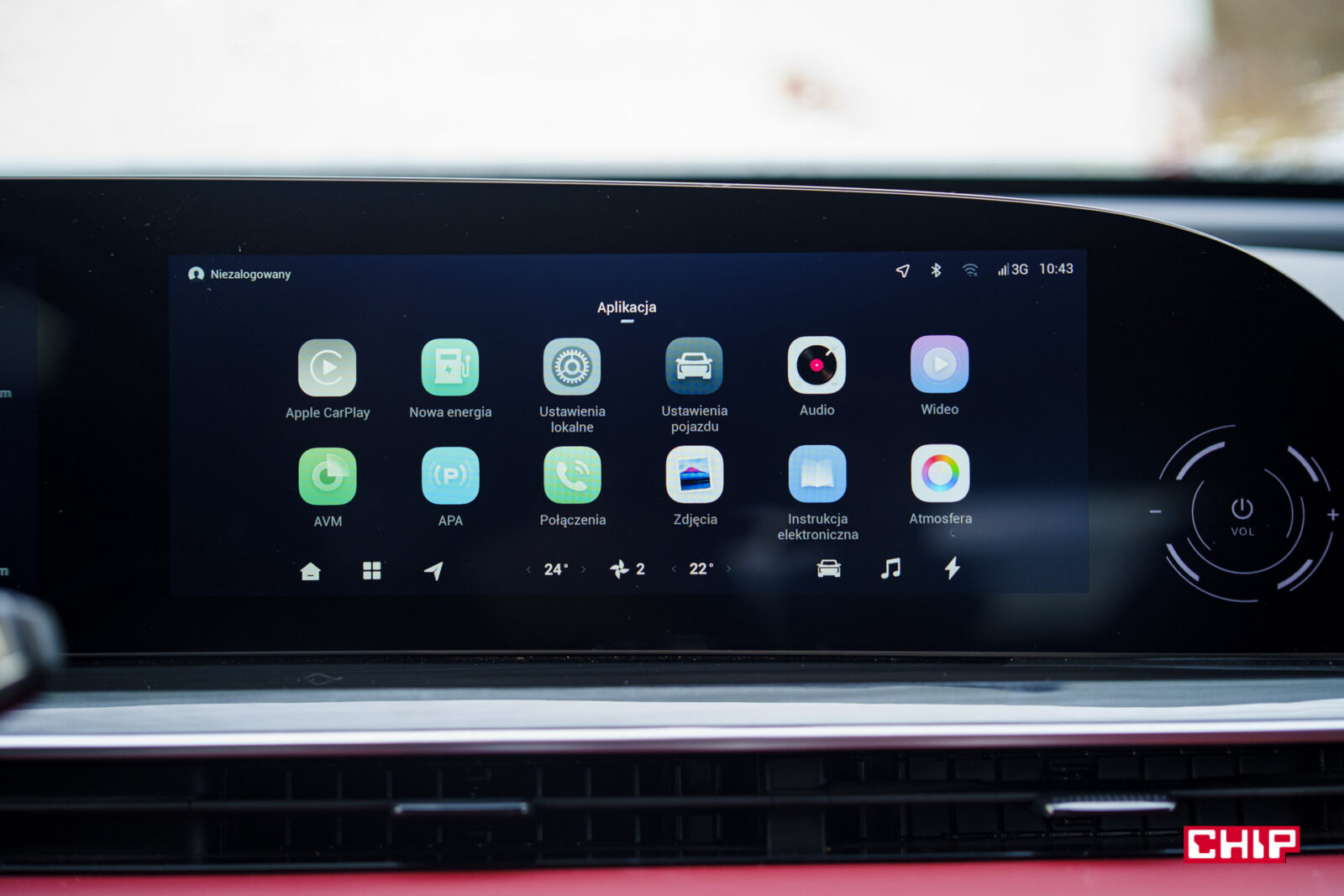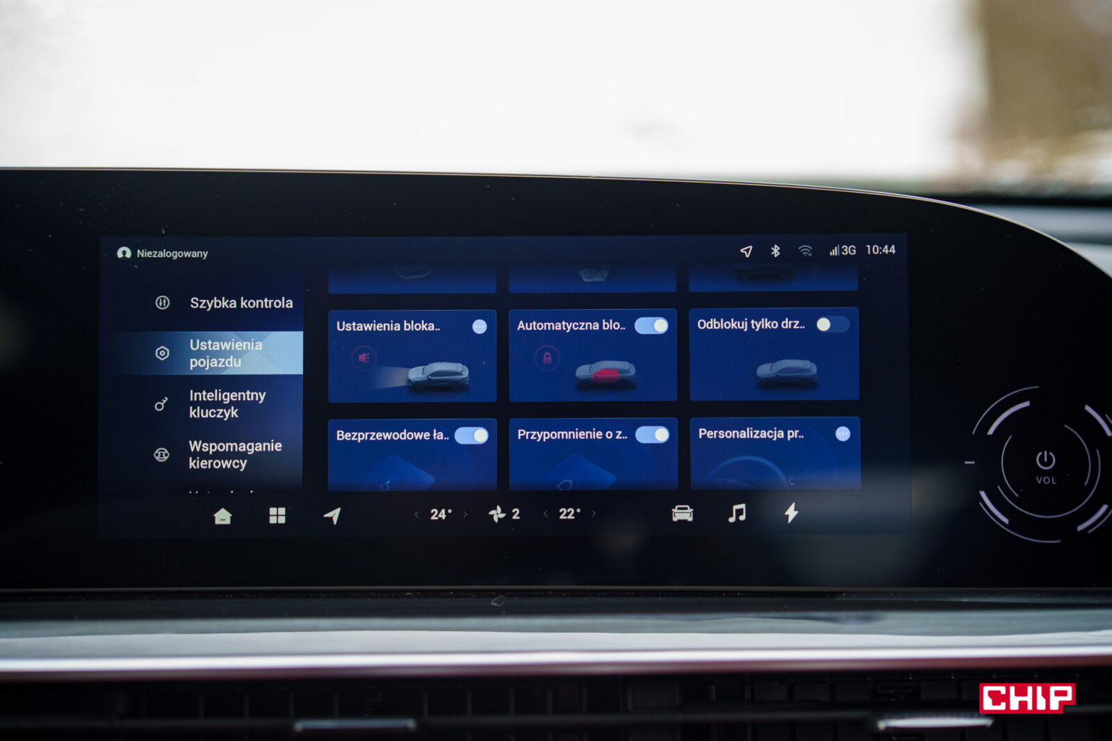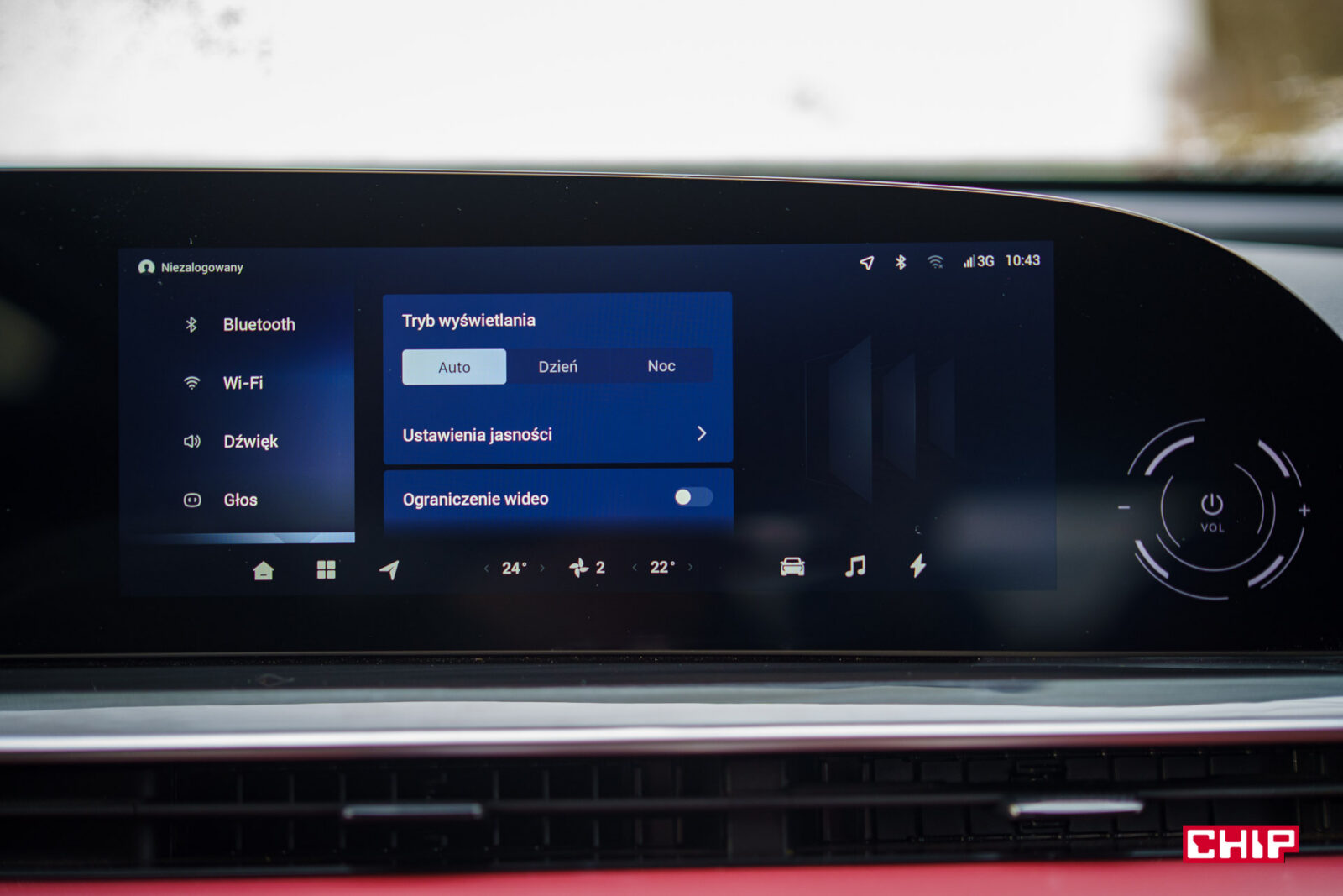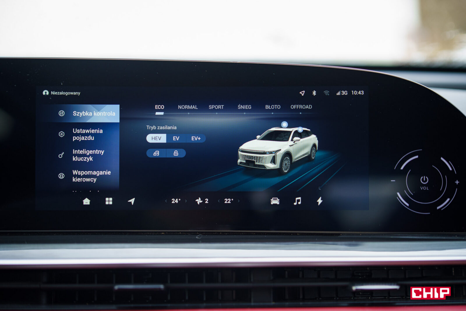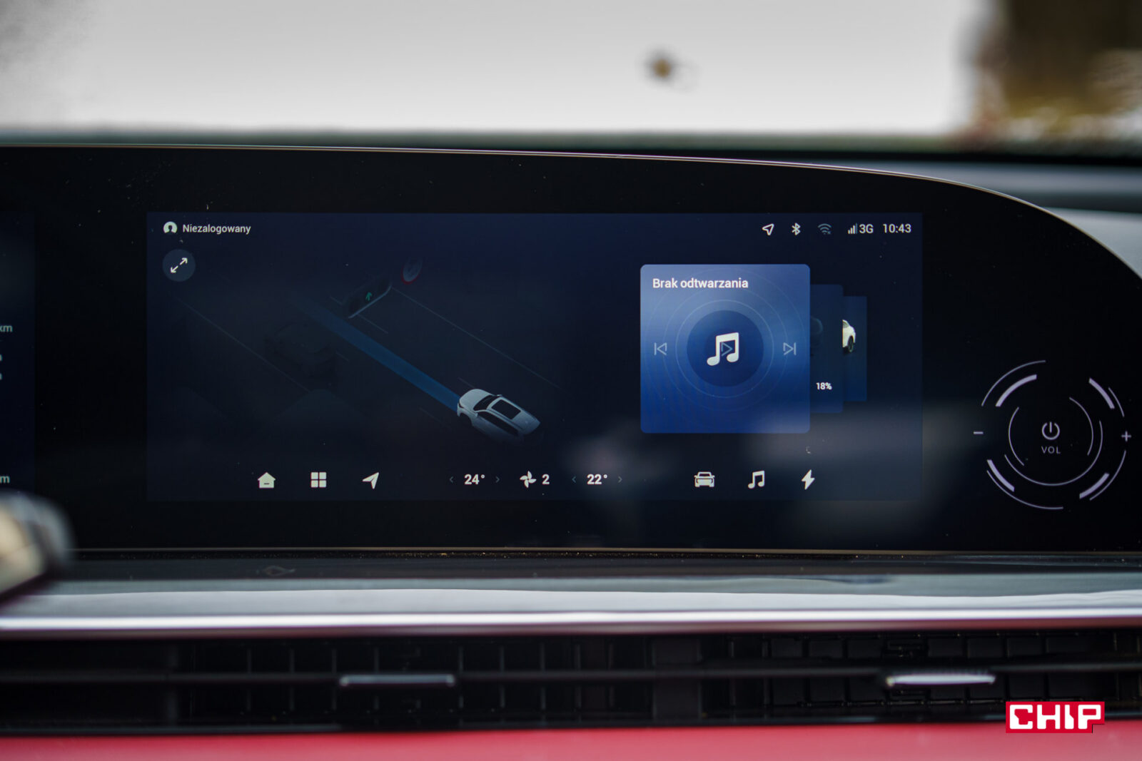 Również na ekranie mamy sterowanie klimatyzacją. Przynajmniej częściowo, bo jak już wiemy, kierowca może nią sterować pokrętłami, ale już pasażer musi trochę poklikać. Tak, sprawiedliwe, ale jak to bywa w chińskich autach, sterowanie klimatyzacją znika po włączeniu Androida Auto lub Apple CarPlay (działające bezprzewodowo). Więc każdorazowo trzeba rozwijać belkę z dołu ekranu, włączać Menu klimatyzacji i klikać…