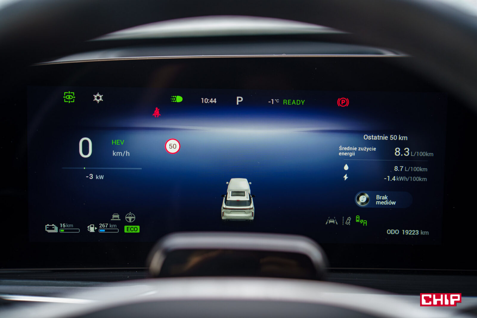 Ekran uzupełnia ogromny head-up, producent chwali się, że o przekątnej aż 50 cali. Niestety za mocno ktoś tu poszedł w rozmiar, a za mało w jakość, bo wyświetlana grafika momentami nie wygląda dobrze i na pewno znajdą się kierowcy, którzy z tego powodu head-up mogą zwyczajnie wyłączać.