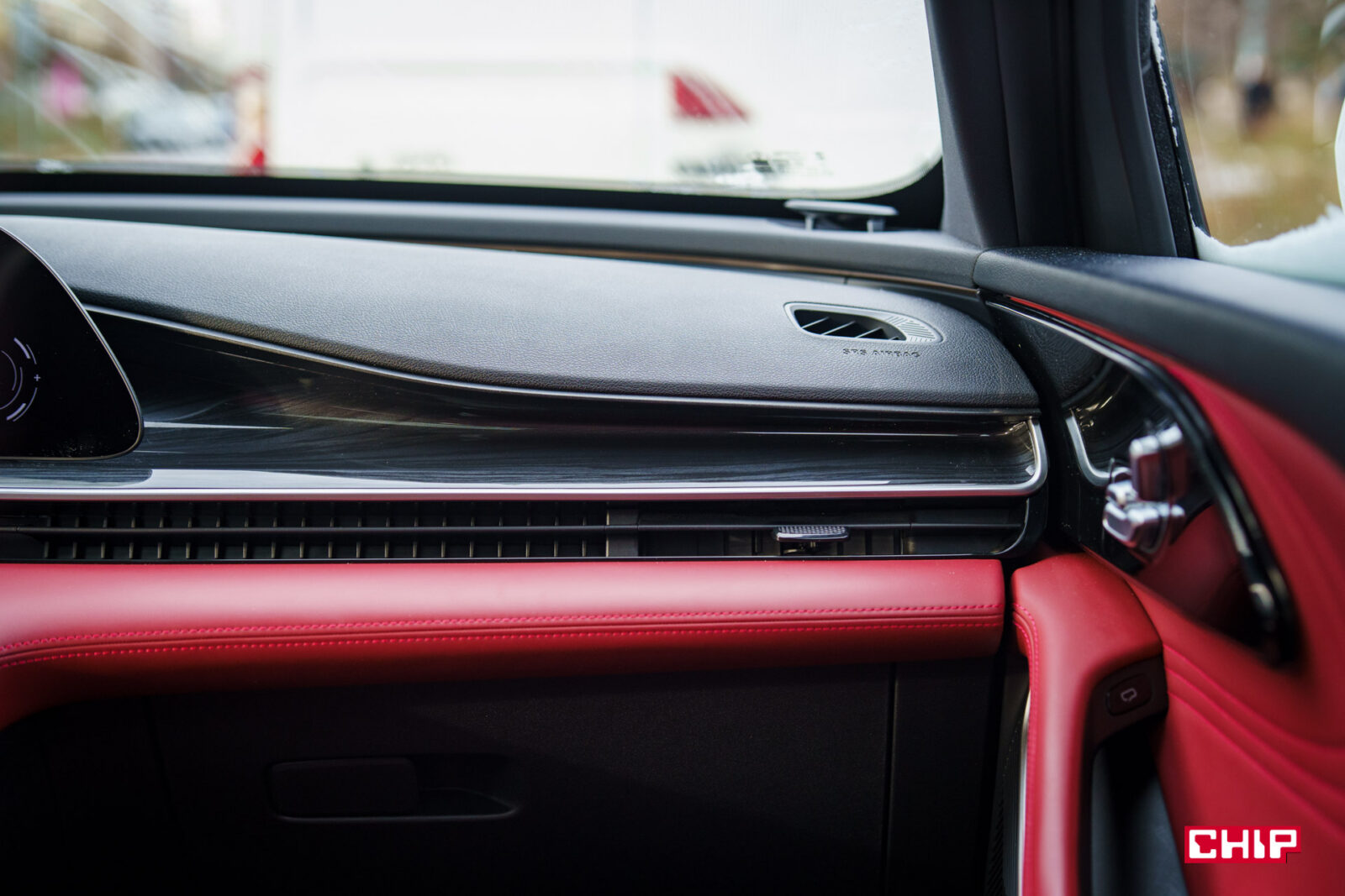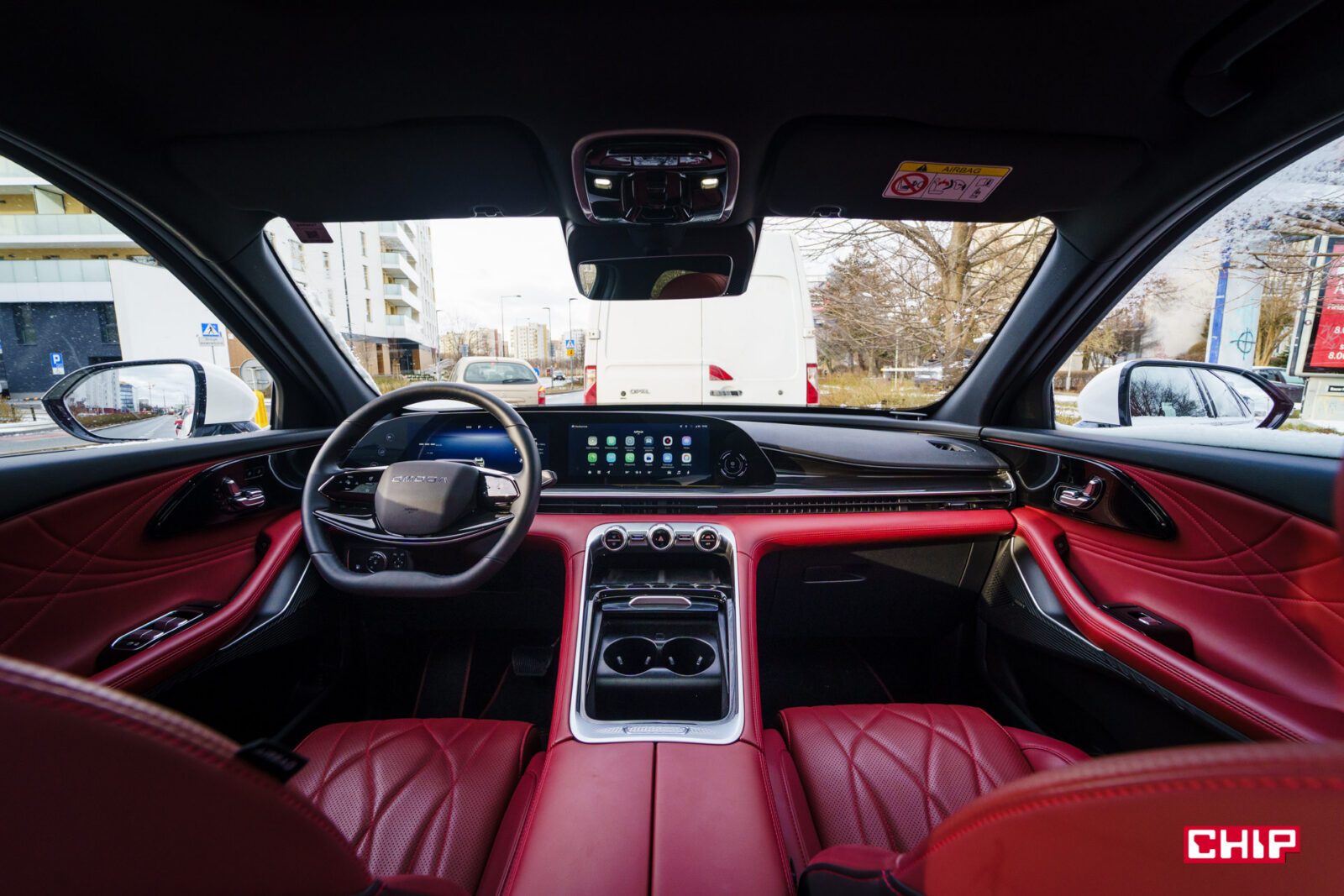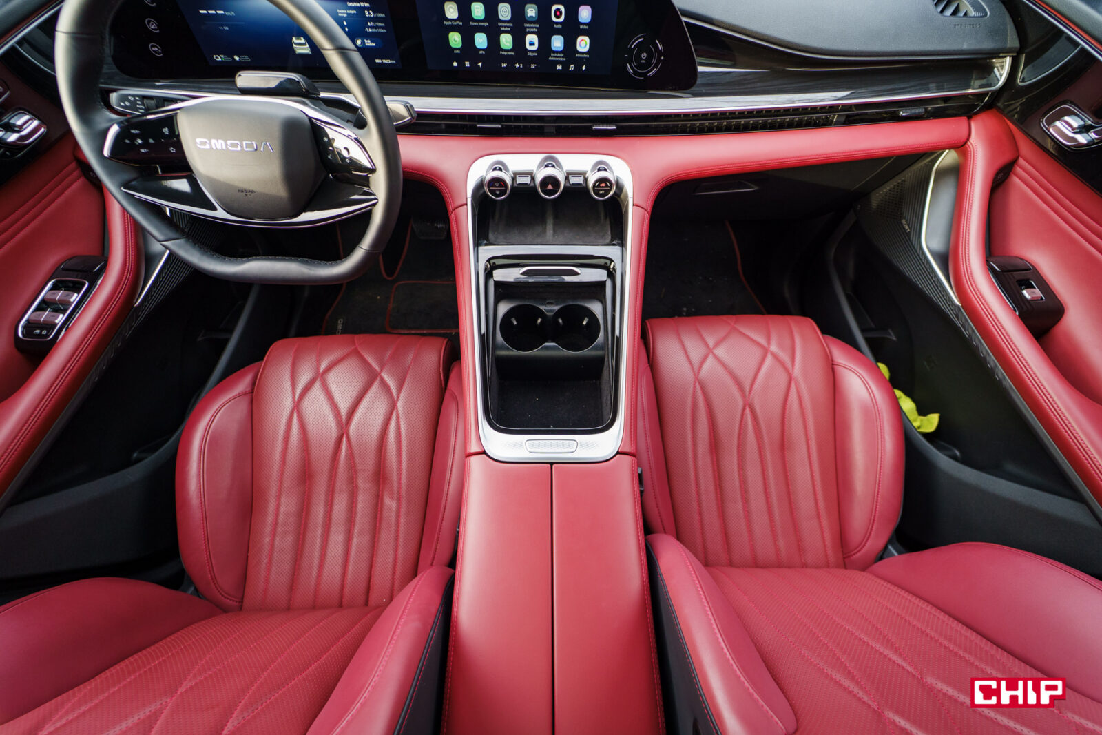 Czerwone, skórzane wnętrze testowej Omody 9 to zdecydowanie wariant dla odważnych. Fakt, wygląda to bardzo bogato, ale też to faktycznie z bliska wygląda drogo. Skóra jest wysokiej jakości, jest solidnie przeszyta i takiego wykonanie nie powstydziłoby się auto za ponad 500 000 zł.